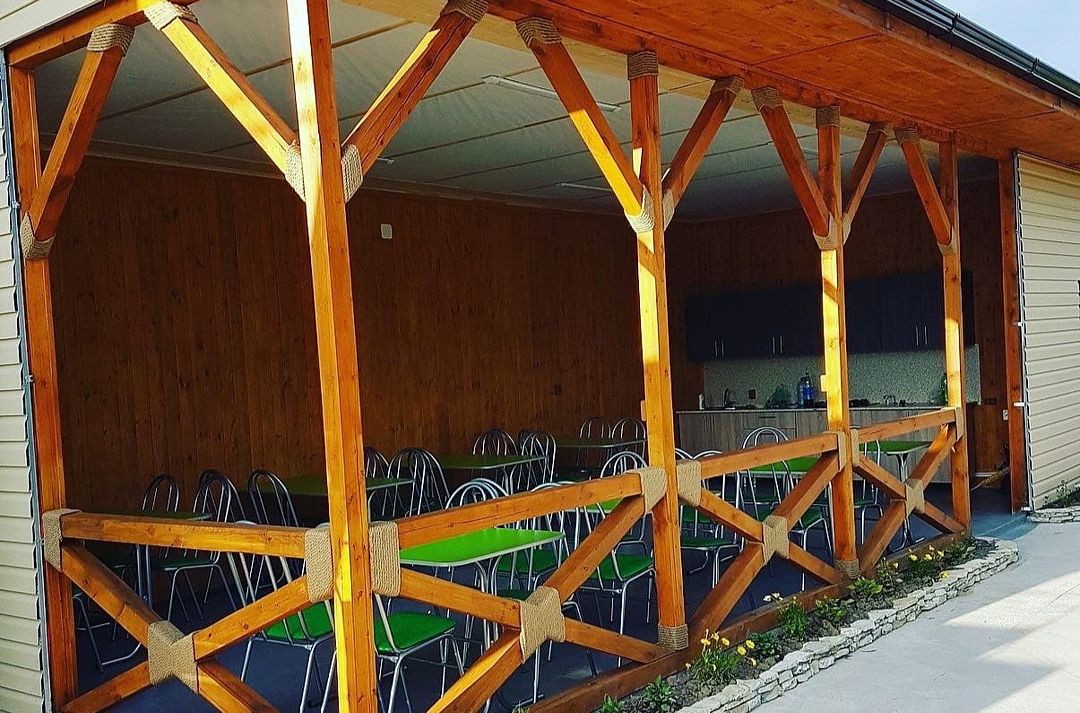 На территории работает кухня и столовая, обустроенная техникой, посудой, сплит системой, а также бар. В распоряжении отдыхающих беседка и мангал, принадлежности для барбекю. Для отдыха обустроена специальная зона. Для детишек – игровая площадка. Доступен беспроводной интернет Wi-Fi. На территории гостевого дома ведется круглосуточное видеонаблюдение. Для личного транспорта отдыхающих предусмотрена парковка.