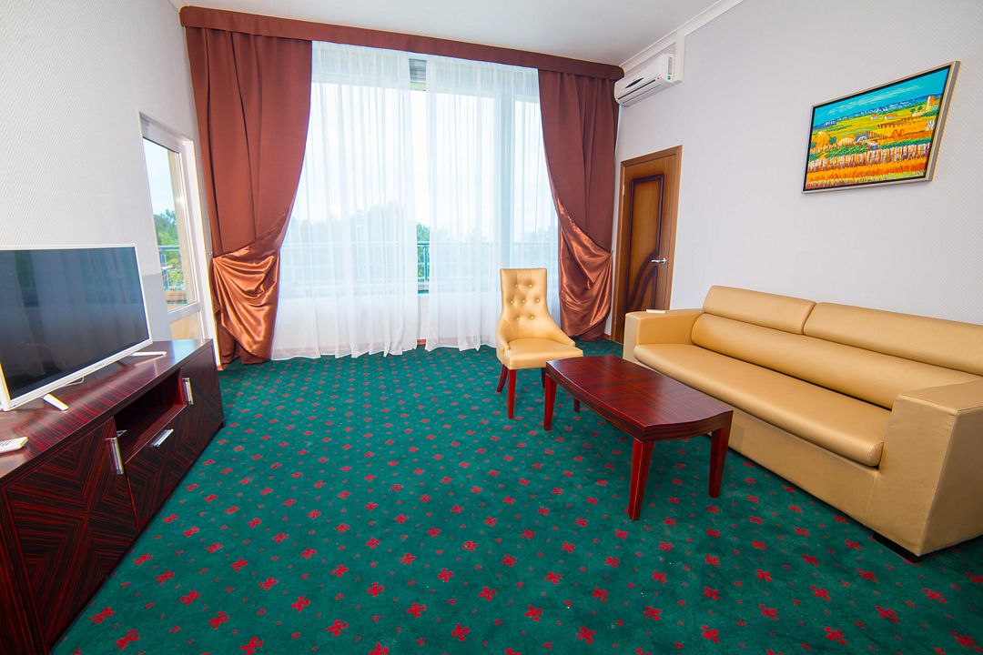 В номере: кровать кинг-сайз 2.2х1.8 м с ортопедическим матрасом, лоджия с интерактивными креслами и раздвижными окнами, мягкая мебель, 2 кондиционера, телевизор 40, мини-бар, сейф, ванная комната с джакузи, феном и душевой кабиной, полотенца для лица, тела и ног, халат, тапочки, пляжное полотенце. Расположение номера: 5 этаж. Доп. место - диван-кровать, также, в зависимости от возраста, предоставляется кресло-кровать или еврораскладушка, либо детская кроватка