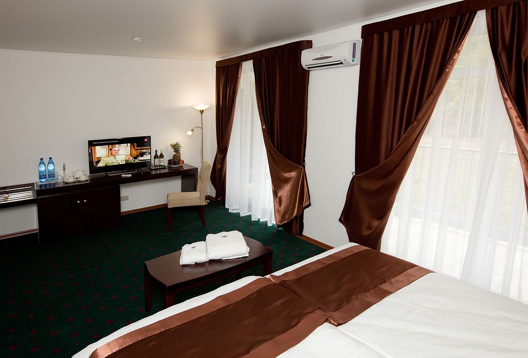 В номере: две кровати бокс-спринг 2х1 м либо одна кинг-сайз 2.2х1.8 м с ортопедическим матрасом, санузел 6 кв.м с душевой кабиной и феном, полотенца для лица, тела и ног, кондиционер, телевизор, мини-бар, сейф, халат (по запросу), тапочки, пляжное полотенце.