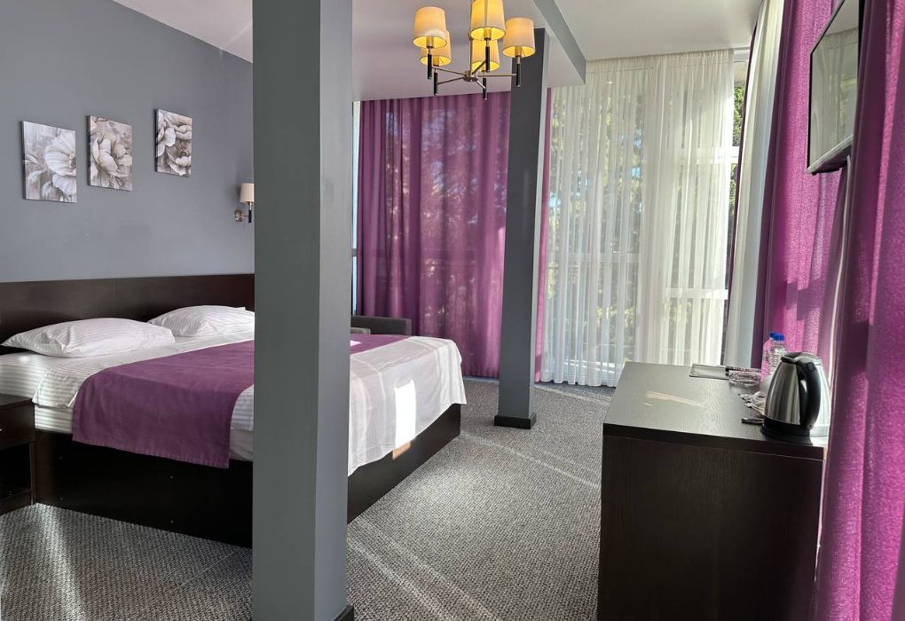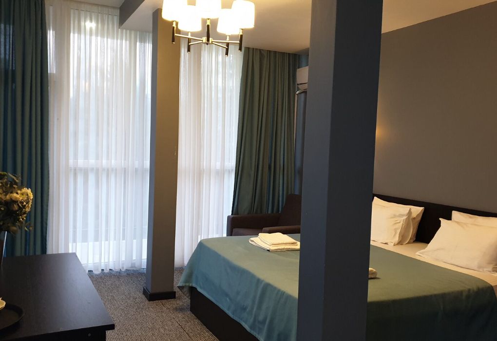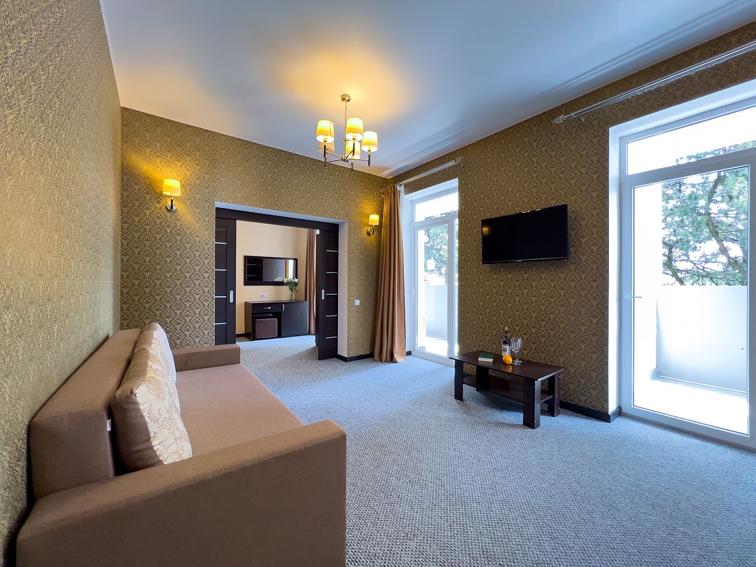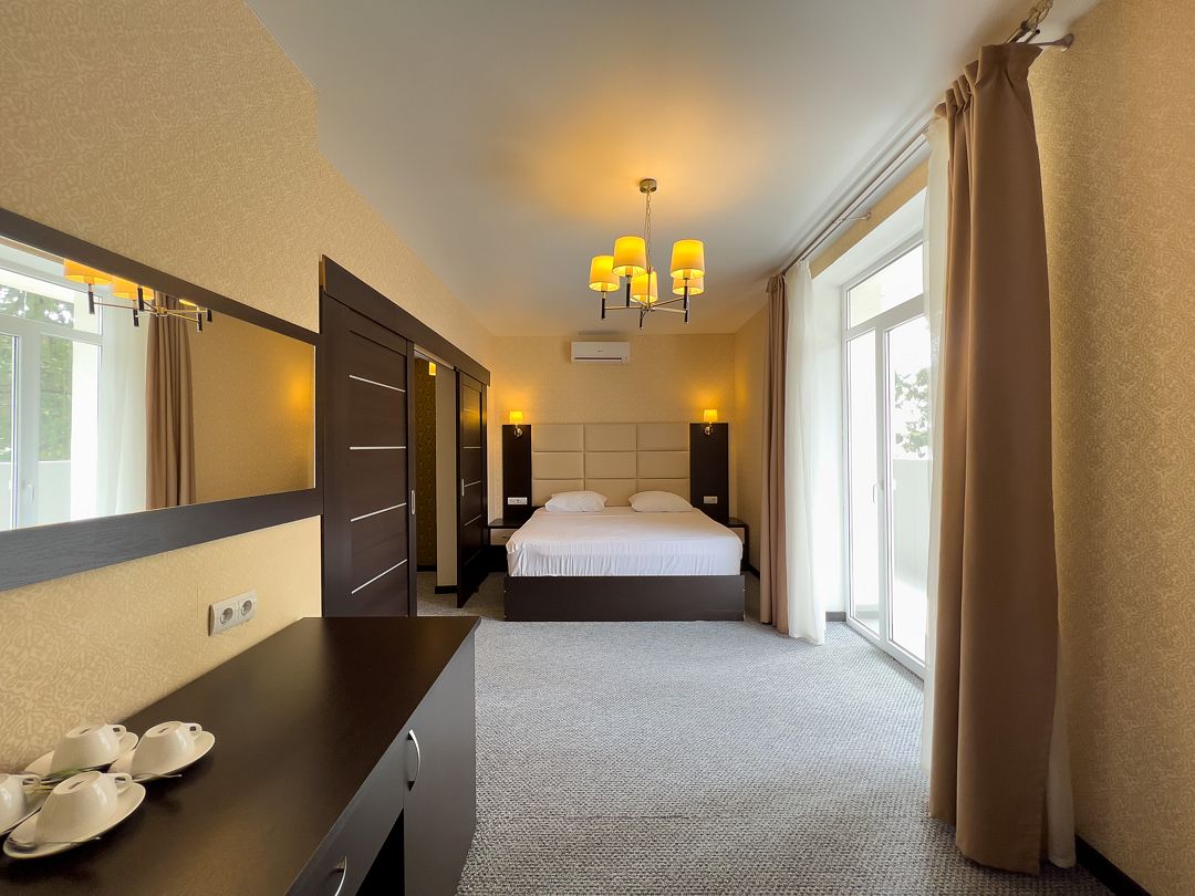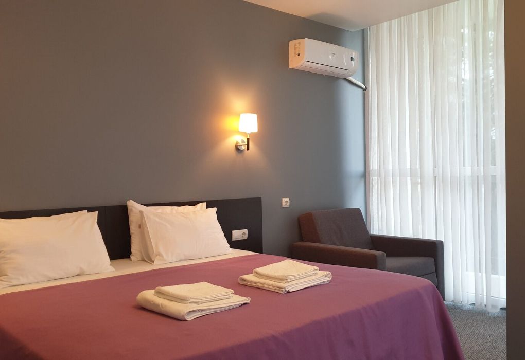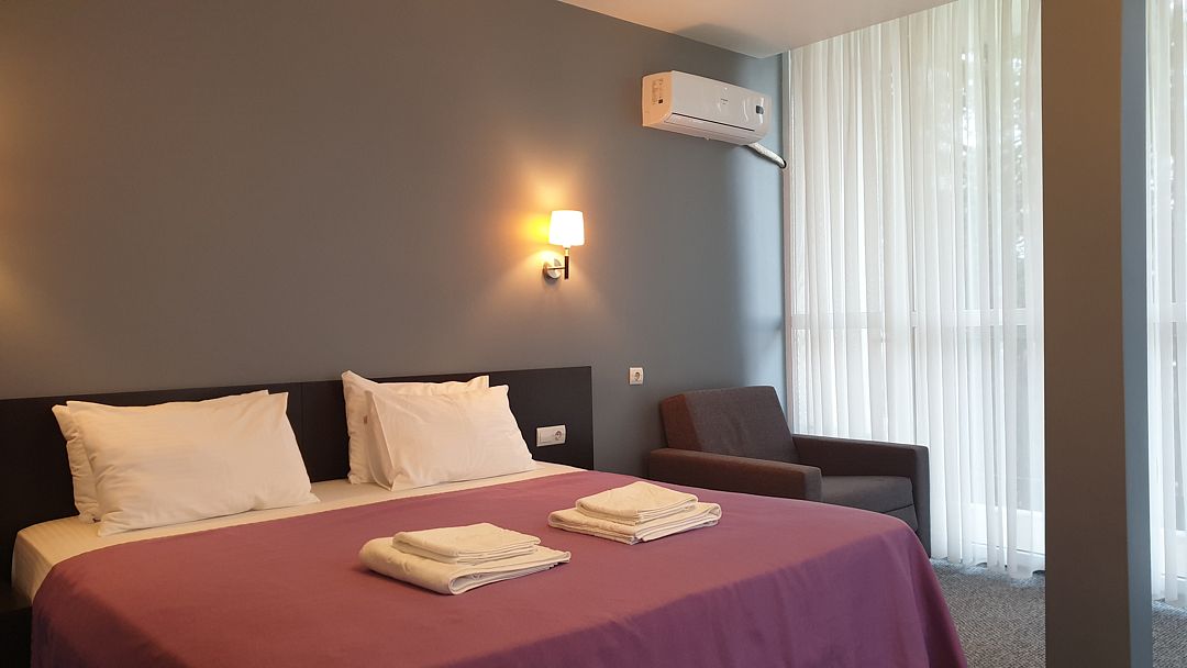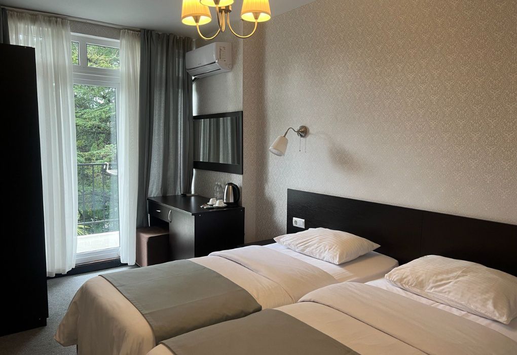 Четырехэтажный корпус отеля разместился на огороженной охраняемой территории с красивой парковой зоной и реликтовыми соснами. В распоряжении гостей комфортабельные номера нескольких категорий. Каждый номер отеля имеет собственный санузел с душем и оборудован необходимым набором бытовой техники: кондиционером, холодильником, телевизором, сейфом. Часть номеров оснащена балконами.