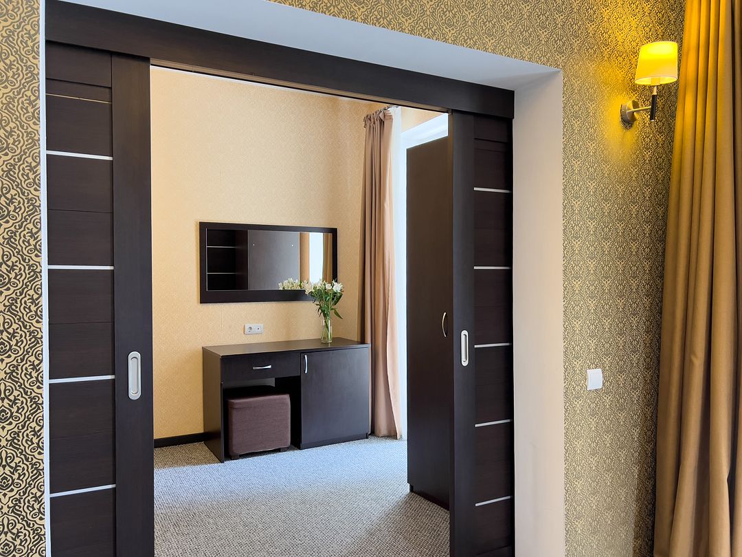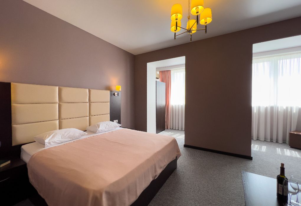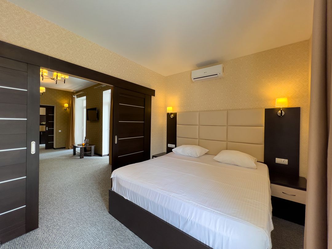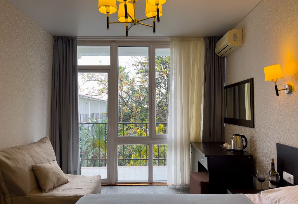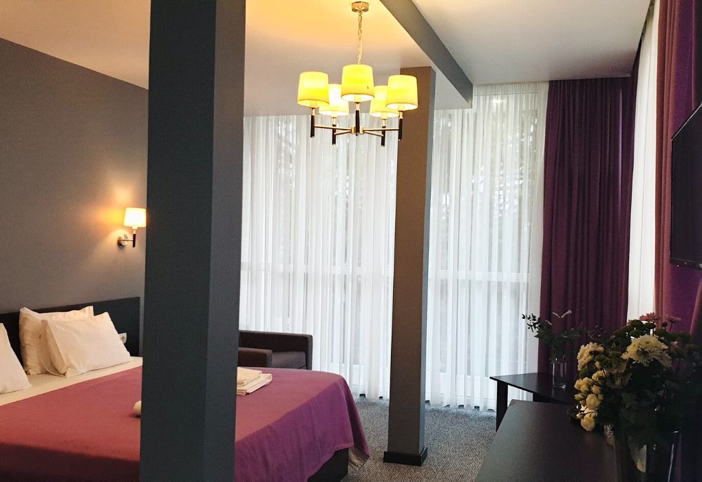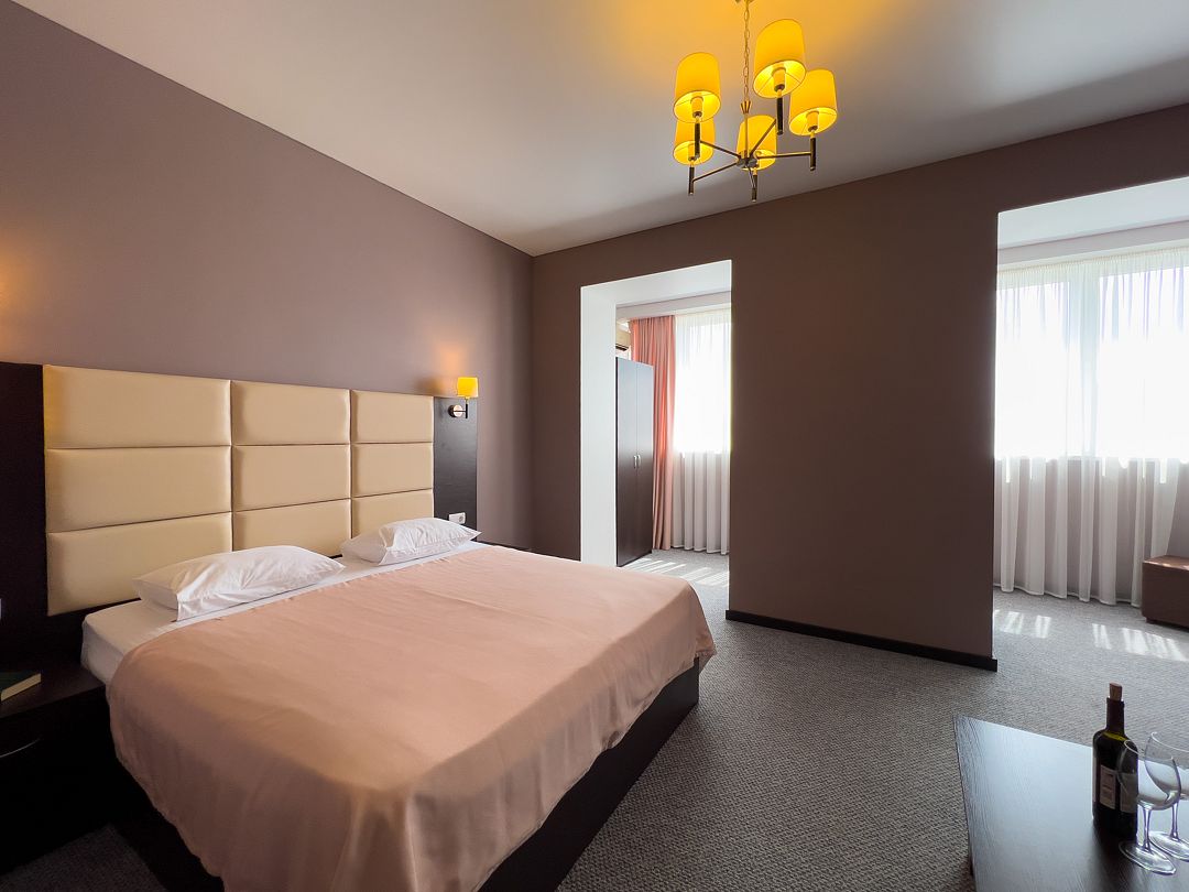 Четырехэтажный корпус отеля разместился на огороженной охраняемой территории с красивой парковой зоной и реликтовыми соснами. В распоряжении гостей комфортабельные номера нескольких категорий. Каждый номер отеля имеет собственный санузел с душем и оборудован необходимым набором бытовой техники: кондиционером, холодильником, телевизором, сейфом. Часть номеров оснащена балконами.