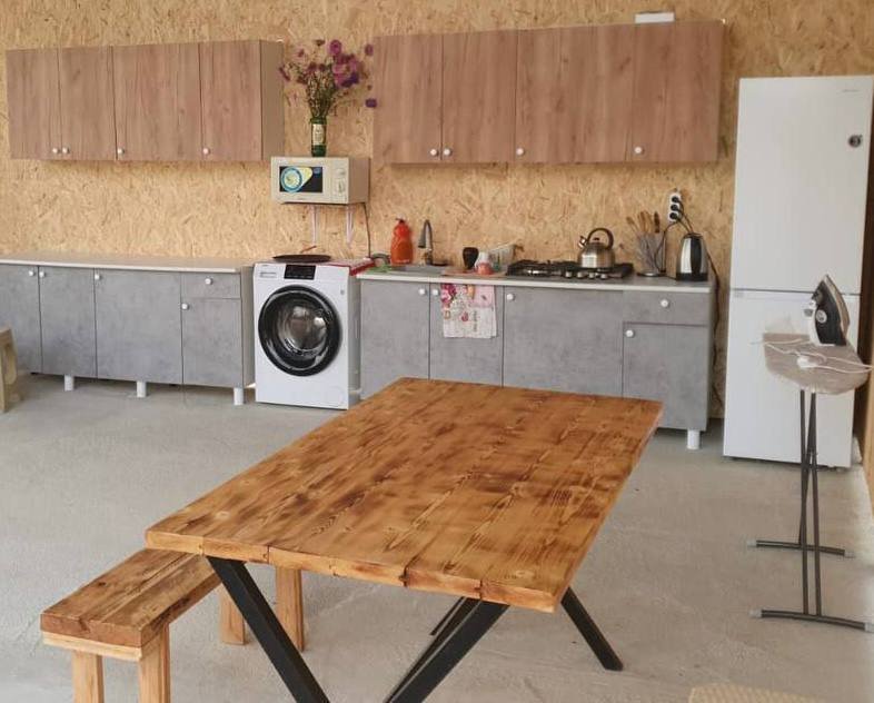 Все необходимое для приготовления и приема пищи: холодильник, плита, микроволновка, посуда, мангальная зона, столики. Есть стиральная машина для отдыхающих.