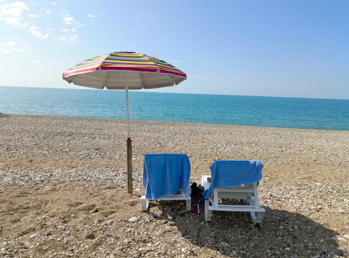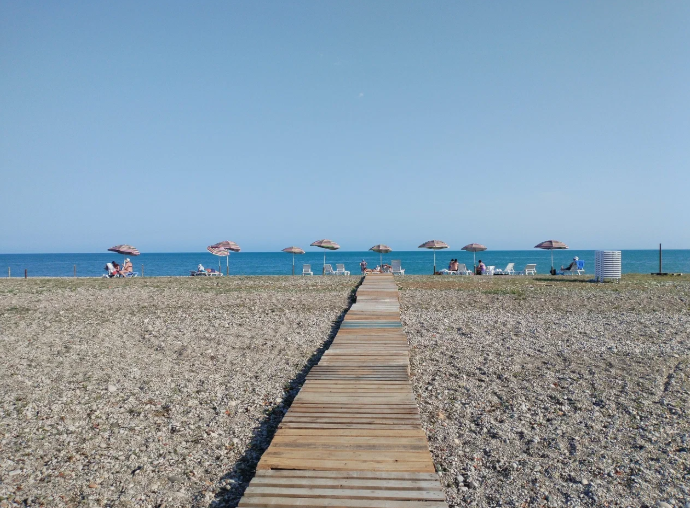 Арендованный пляж турбазы с мелкой галькой, расположен в 2-3 минутах ходьбы от корпуса, обеспечен необходимыми для полноценного отдыха раздевалками и душевыми, навесами и другими удобствами. Работает пункт проката, где можно арендовать зонты, лежаки и шезлонги.