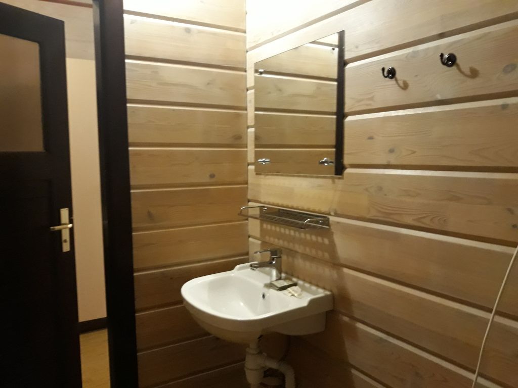 В туалете не хватает стаканчика под зубные щётки, ёмкость под мыло.