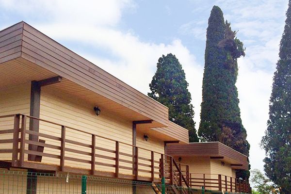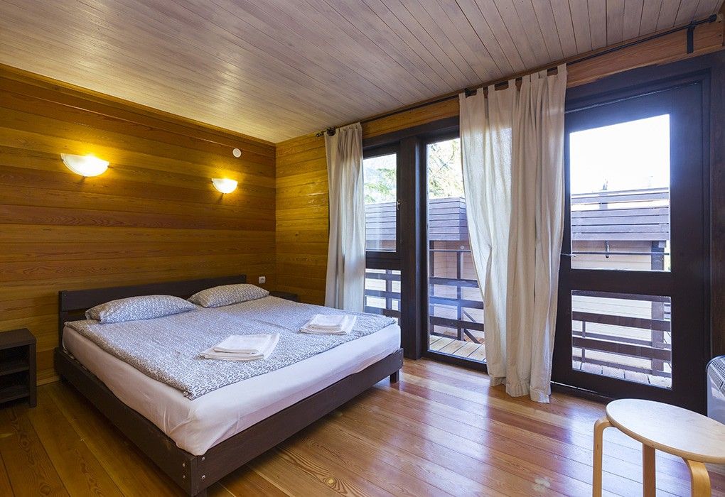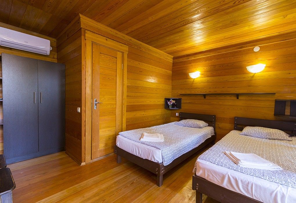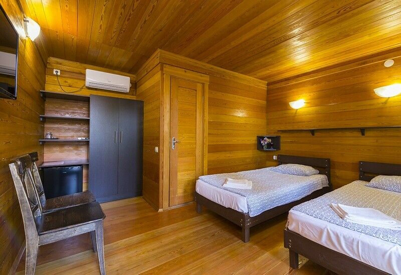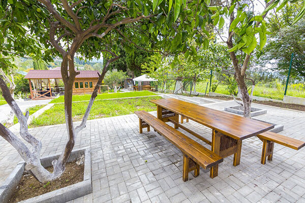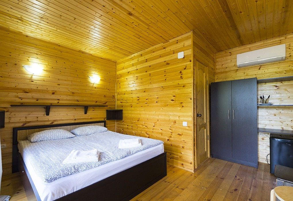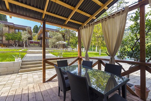 Гостей встречает сад с зелеными лужайками, высокие кипарисы, огороженная территория, прогулочные дорожки и сами коттеджи, построенные из экологически чистых материалов. К стойке регистрации можно подходить в любое время: она работает круглые сутки. В номерах – идеальный порядок, чистота и уют. В распоряжении отдыхающих – широкие кровати, кондиционеры, шкафы для одежды, удобные стулья, большие телевизоры, балконы, санузлы с душем, повсеместный Wi-Fi и терраса.