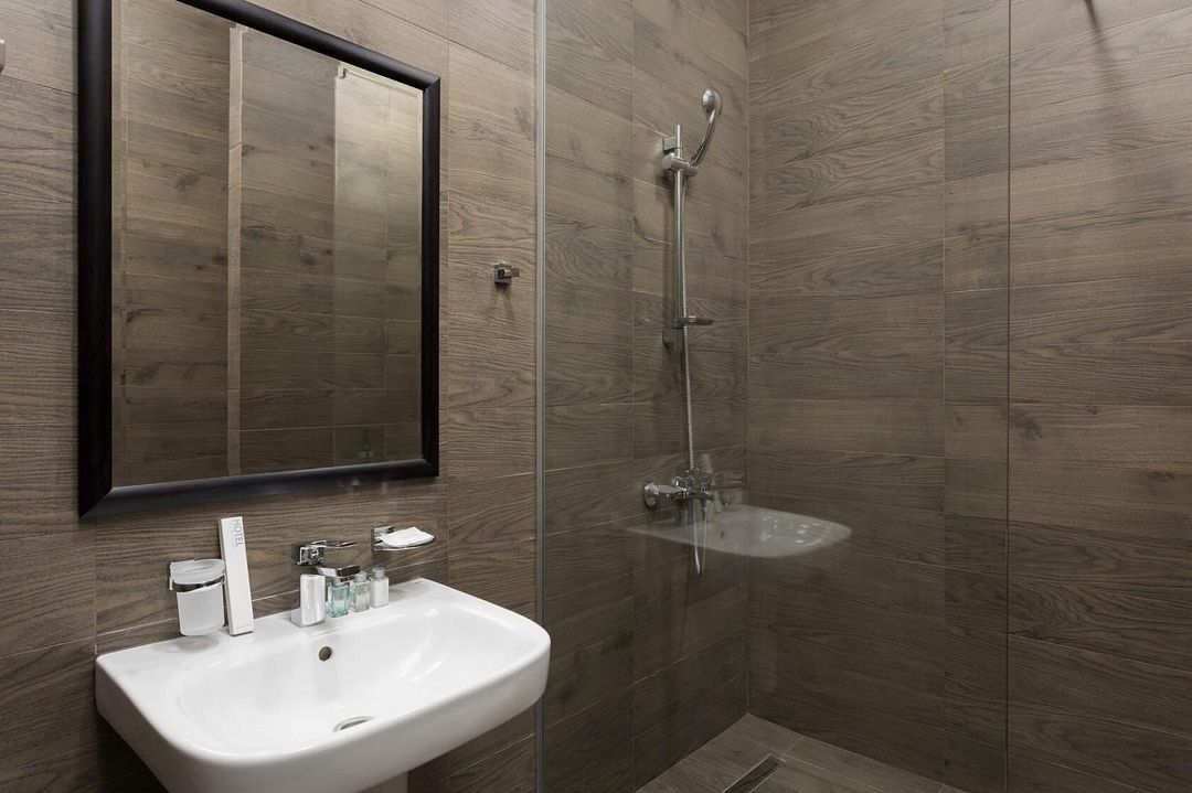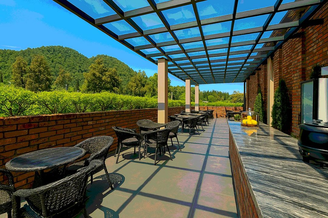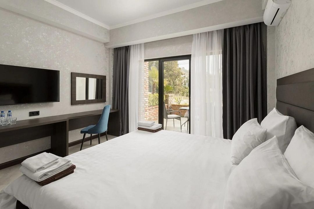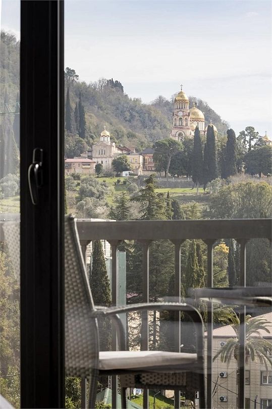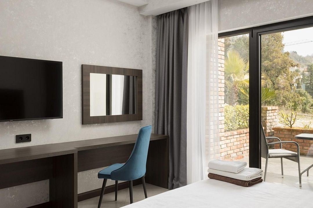 Двухместный номер делюкс с кроватью размера "king-size" с видом на гору, Анакопийскую крепость, Ново-Афонский монастырь и собственной мини террасой, на первом этаже. В номере: мини-холодильник, душ, фен, набор полотенец, халат, тапочки, косметический набор, кондиционер, телевизор. Теплый пол. Дополнительное место – еврораскладушка.Услуги и удобства