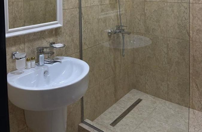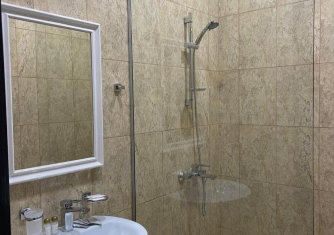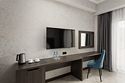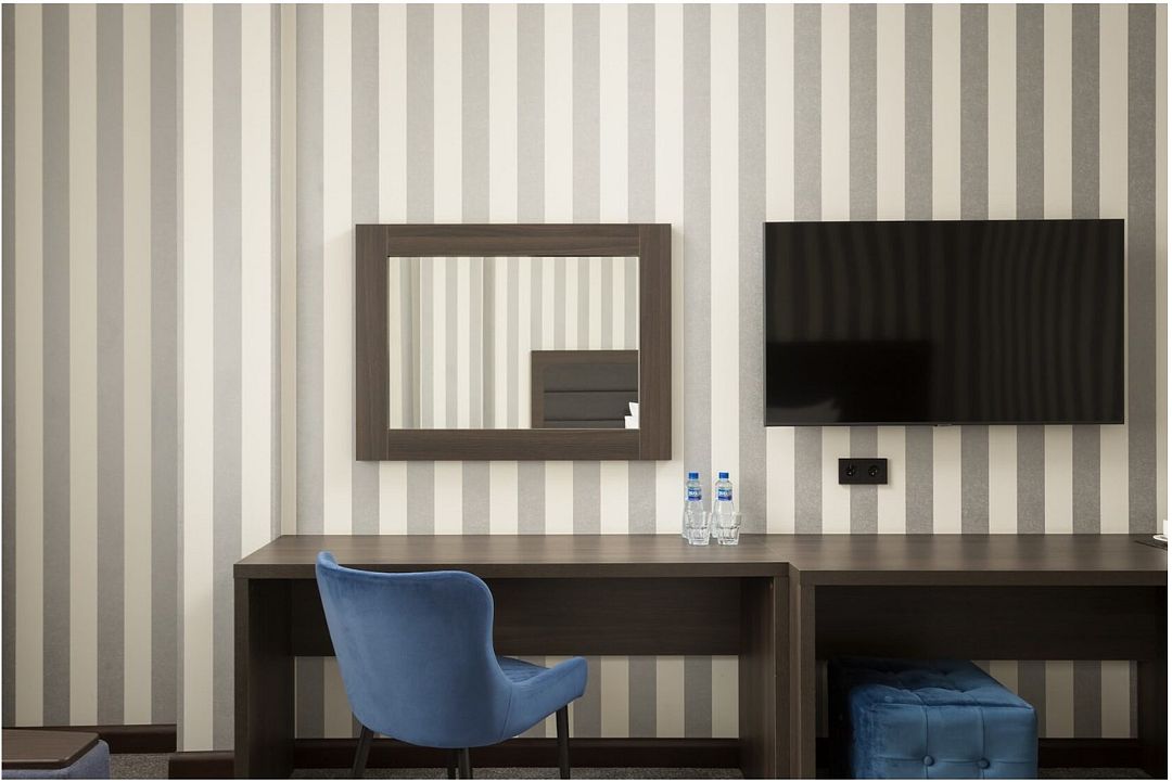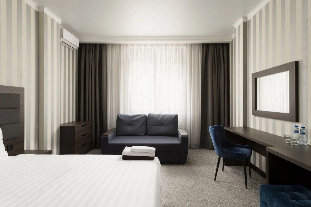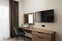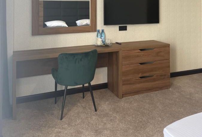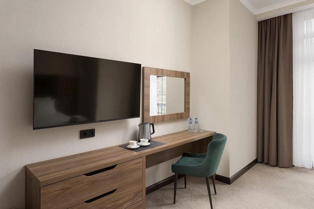 Просторный и уютный номер с современным интерьером Этот номер идеально подойдёт для комфортного отдыха как для пары, так и для индивидуального размещения. Интерьер оформлен в современном стиле с использованием натуральных оттенков и качественных материалов, создающих атмосферу уюта и спокойствия. В номере: Широкая двуспальная кровать с ортопедическим матрасом и белоснежным постельным бельём Кондиционер для поддержания комфортной температуры Рабочая зона с удобным креслом и зеркалом — подойдёт как для работы, так и для макияжа Плоский телевизор с кабельными каналами Просторный шкаф для хранения вещей и зона для багажа Электрочайник, бутылки питьевой воды, чашки — для вашего удобства Современная ванная комната с душевой кабиной, феном и туалетными принадлежностями Мягкое ковровое покрытие на полу добавляет уюта и тепла Номер оформлен в спокойной цветовой гамме, а большие окна наполняют пространство естественным светом. Всё продумано до мелочей — чтобы ваше пребывание было максимально комфортным.Услуги и удобства
