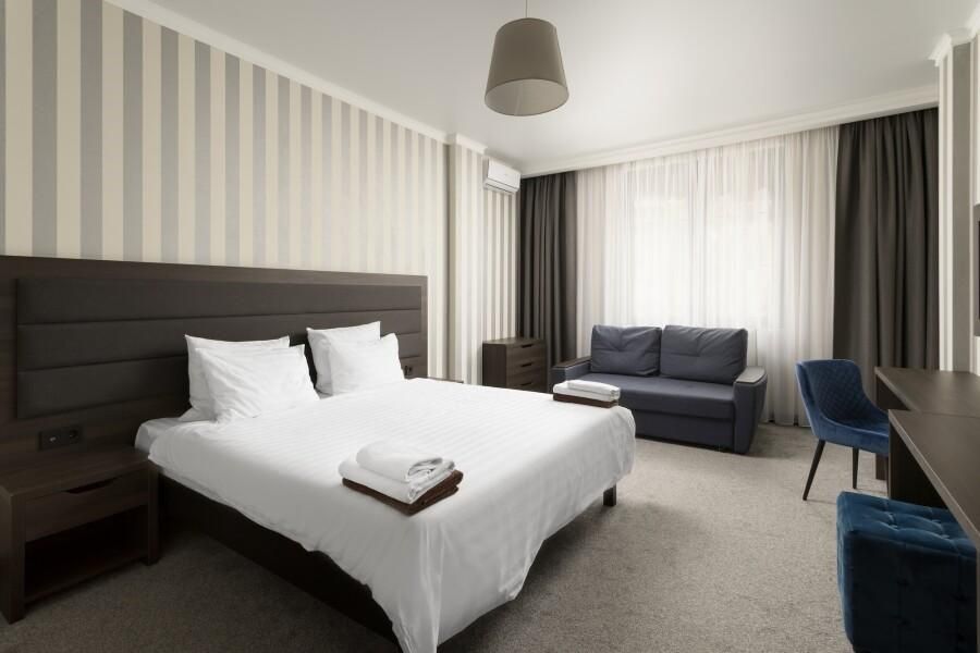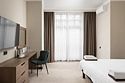 Двухместный номер делюкс с кроватью размера "king-size", без балкона вид во двор. В номере мини-холодильник, душ, фен, набор полотенец, халат, тапочки, косметический набор, кондиционер, телевизор. Дополнительное место – еврораскладушка.Услуги и удобства