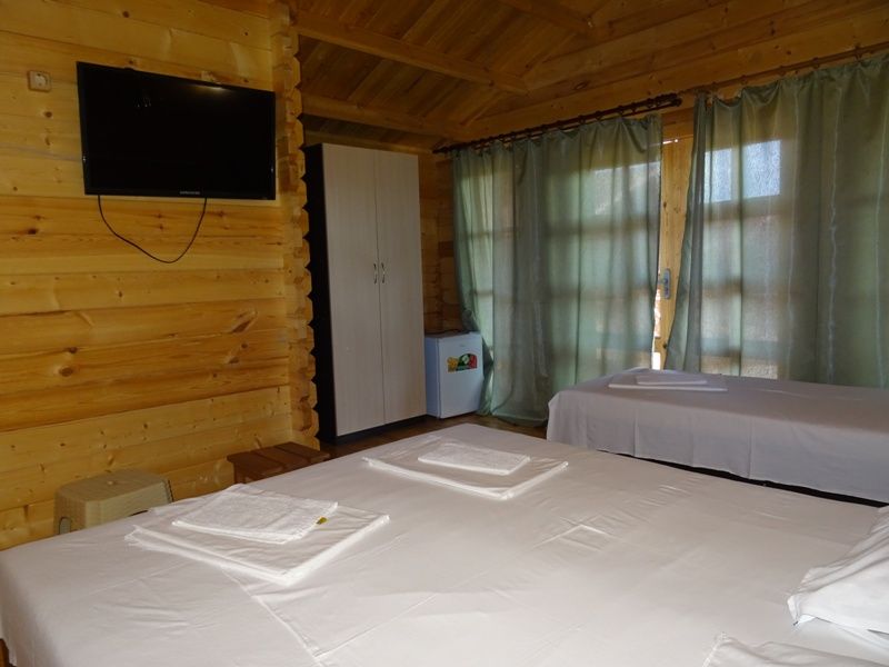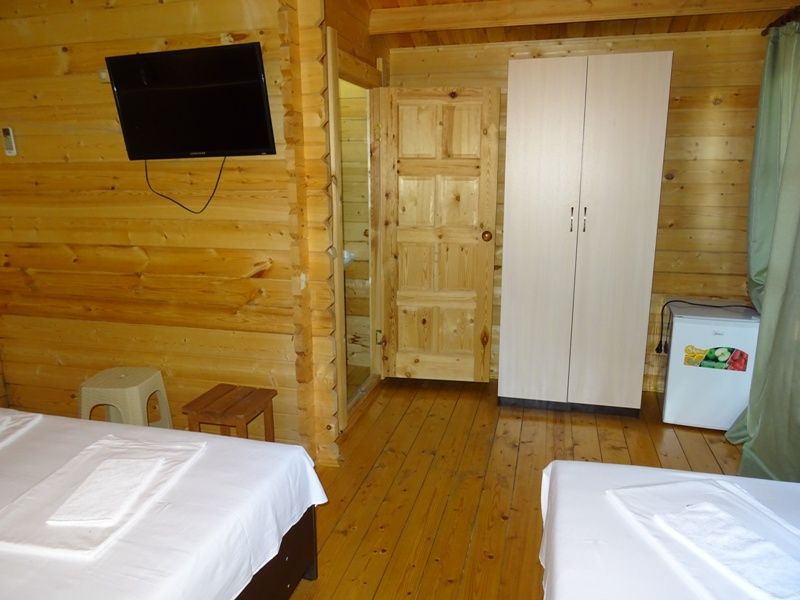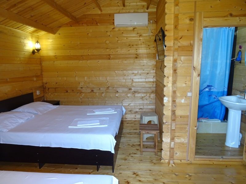 В домиках есть все необходимое - 2-спальная кровать и 1-спальная кровати, ТВ, Wi-Fi, холодильник, сплит-система. Санузел/душ находятся в каждом номере.