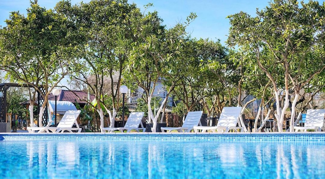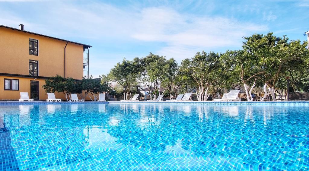На территории работает кафе, к услугам отдыхающих открытый бассейн, а гости, приезжающие на машине, могут воспользоваться охраняемой парковкой. Буквально в паре минут ходьбы находится галечный пляж, на берегу работает бар, есть навесы от солнца, раздевалки, предусмотрен прокат шезлонгов.