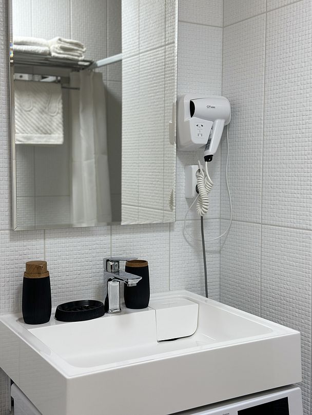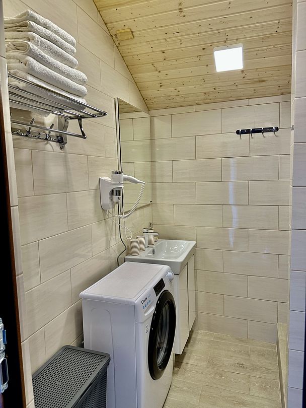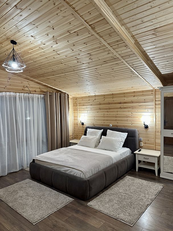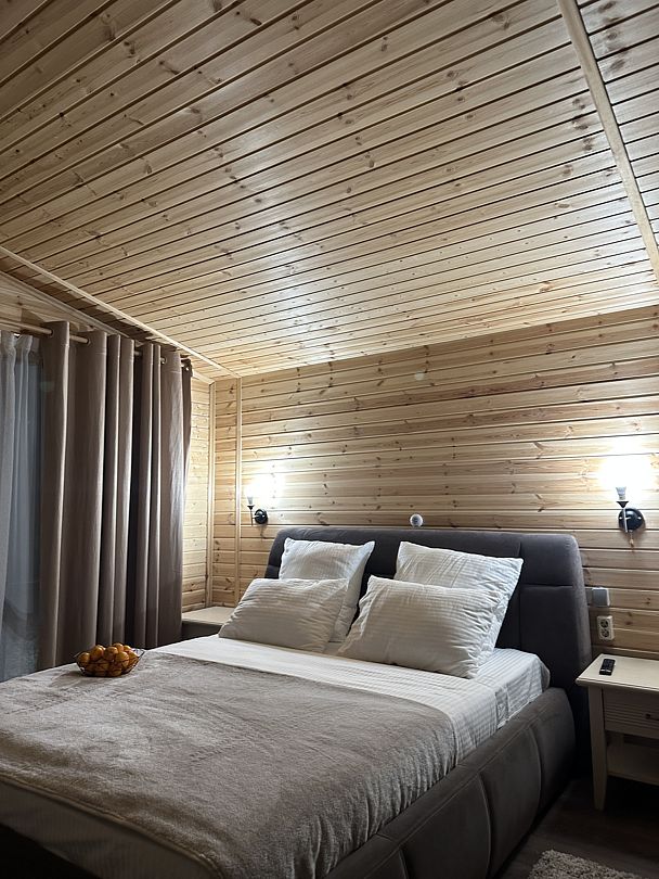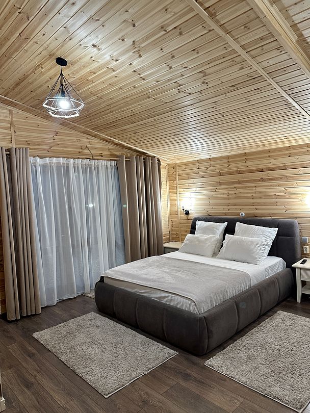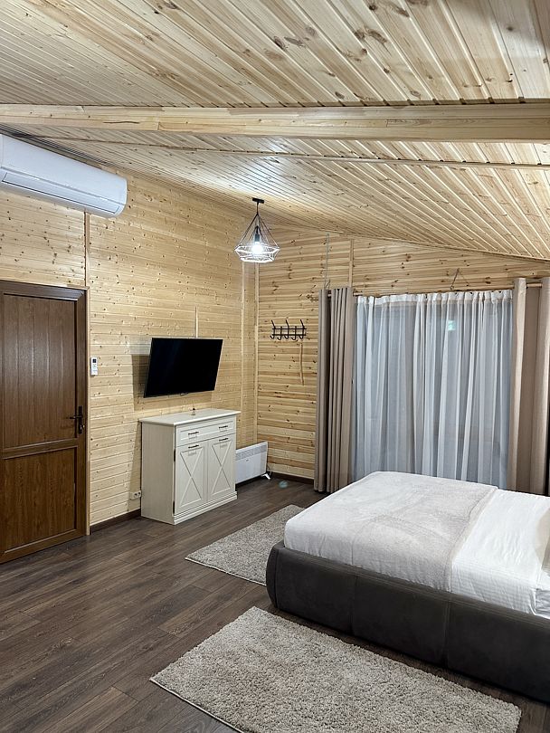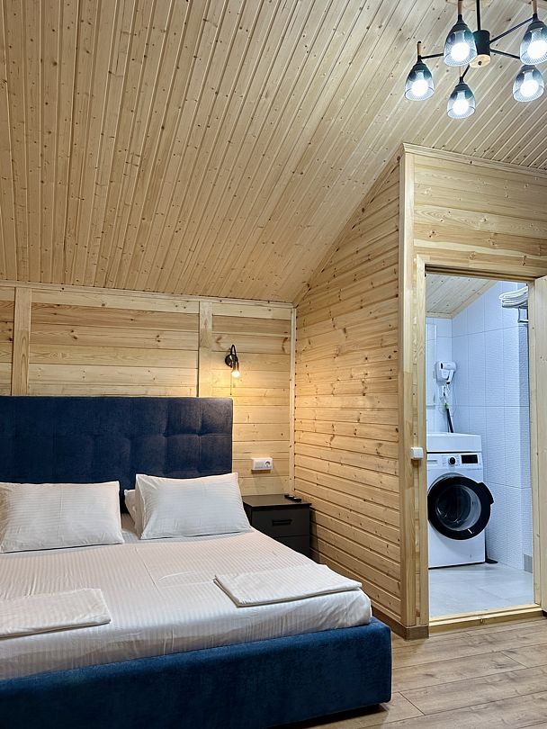 Коттедж-студия 45 кв.м. с кухонным модулем. В домике есть большая кровать, большой раскладной диван, стиральная машинка, кухонным модуль, фен, принадлежности для приготовления чая/кофе, по запросу кофе-машина. Подходит для семьи из 2-4 человек.