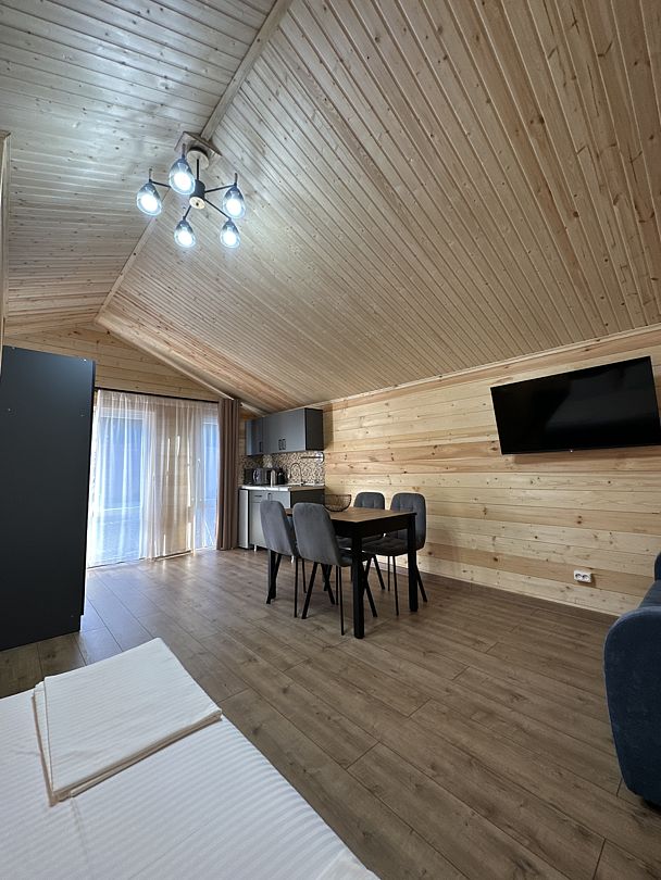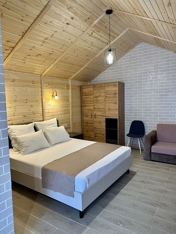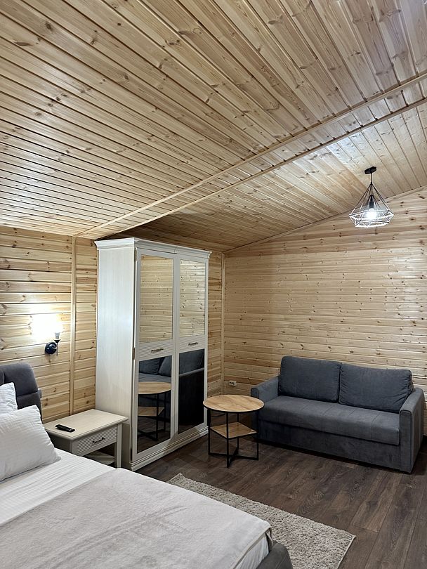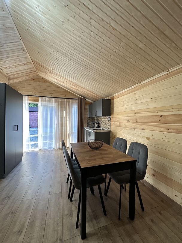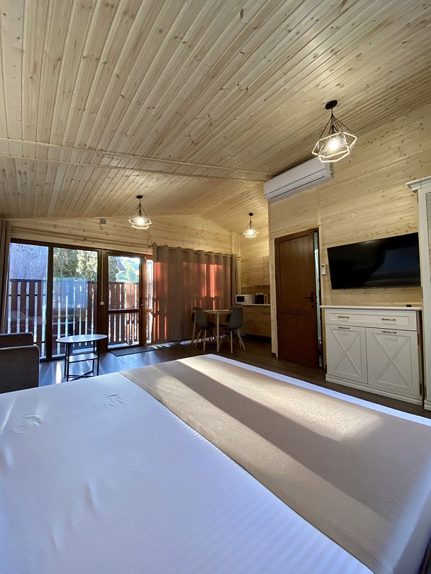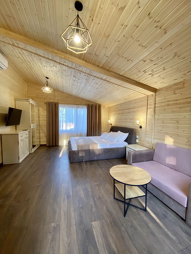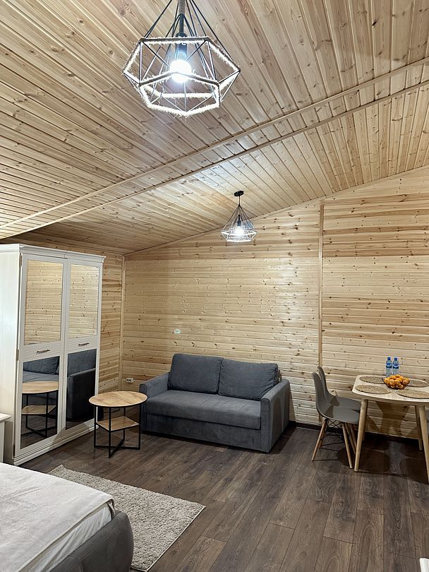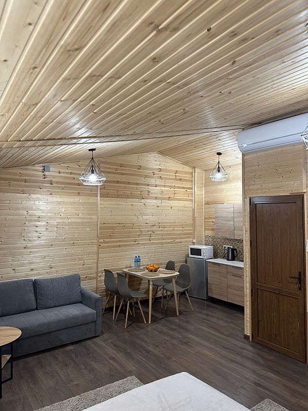 Коттедж-студия 25 кв.м. с кухонным модулем. В домике есть большая кровать, большой раскладной диван, стиральная машинка, кухонным модуль, фен, принадлежности для приготовления чая/кофе, по запросу кофе-машина. Подходит для семьи из 2-4 человек.