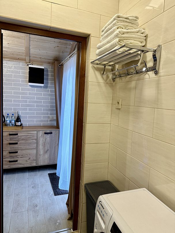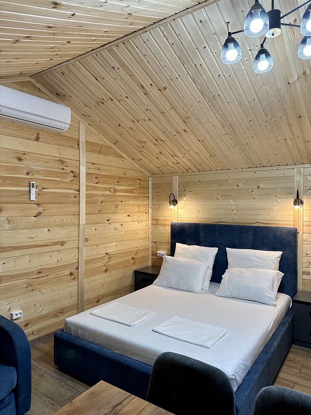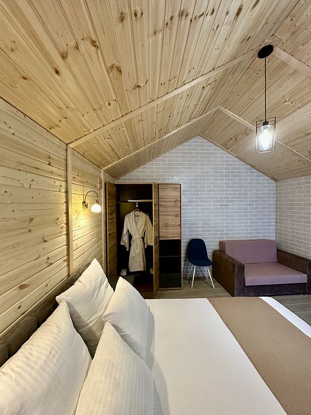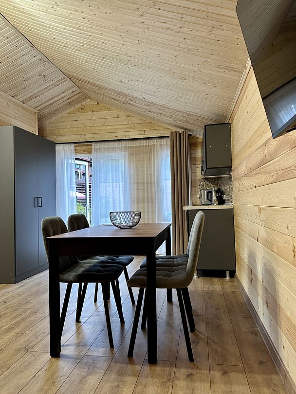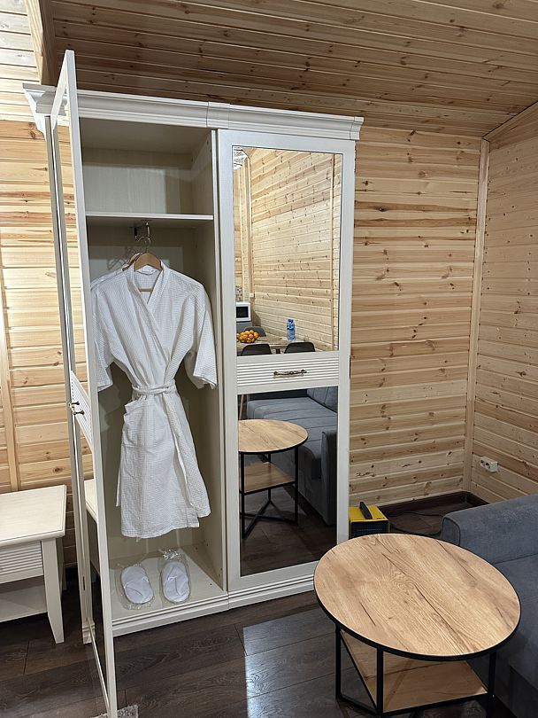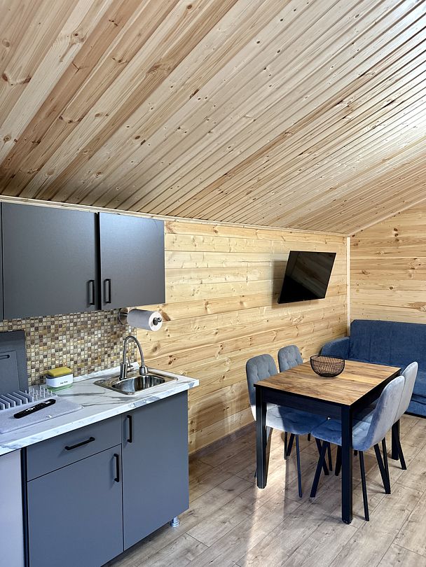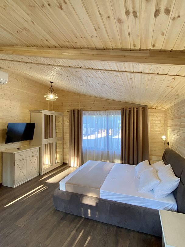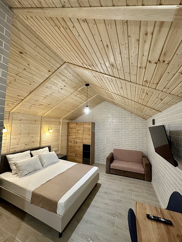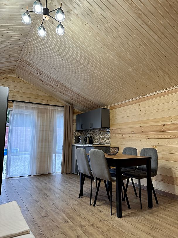 Коттедж-студия 25 кв.м. с кухонным модулем. В домике есть большая кровать, большой раскладной диван, стиральная машинка, кухонным модуль, фен, принадлежности для приготовления чая/кофе, по запросу кофе-машина. Подходит для семьи из 2-4 человек.