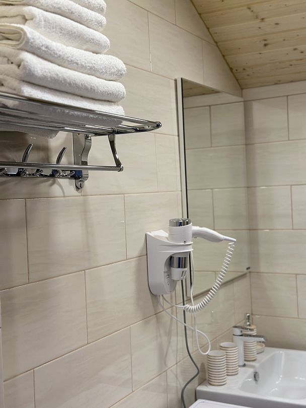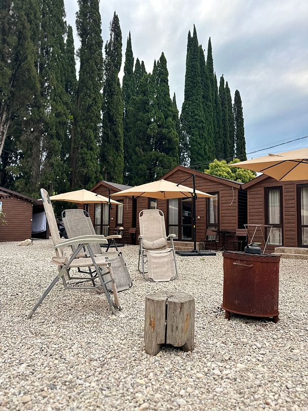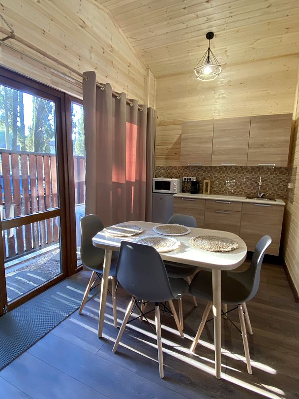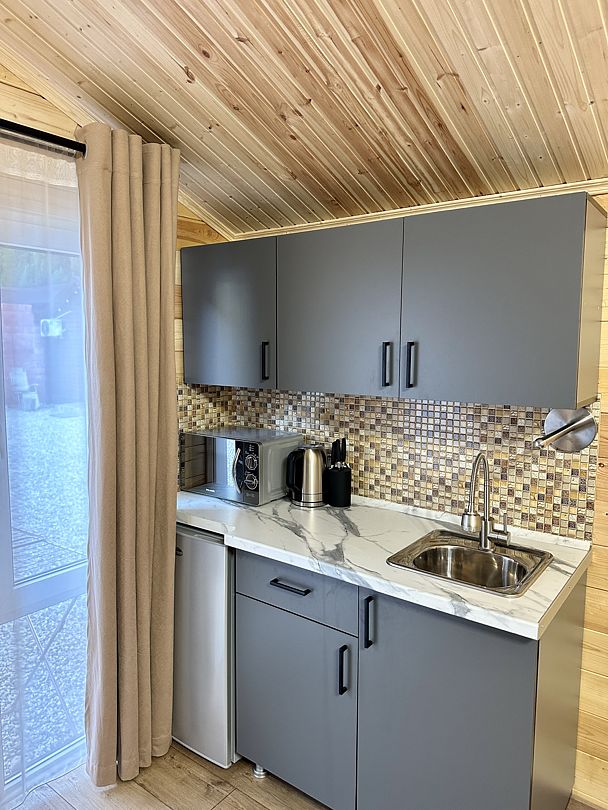 Каждый домик обставлен для комфортного отдыха. В нем вас ждет просторная кровать, большой раскладной диван, стиральная машина, компактный кухонный модуль, фен и принадлежности для приготовления чая и кофе. По предварительному запросу предоставляется кофемашина.