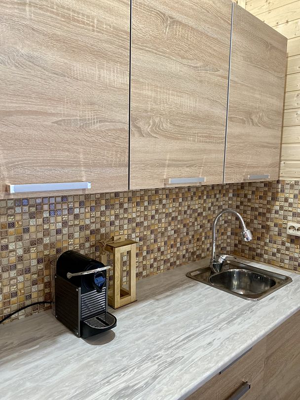 Коттедж-студия 30 кв.м. с кухонным модулем. В домике есть большая кровать, большой раскладной диван, стиральная машинка, кухонным модуль, фен, принадлежности для приготовления чая/кофе, по запросу кофе-машина. Подходит для семьи из 2-4 человек.