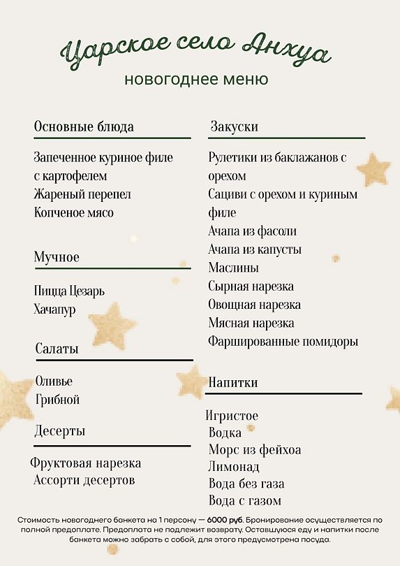 На территории расположено кафе «Анхуа» с блюдами европейской и кавказской кухонь.