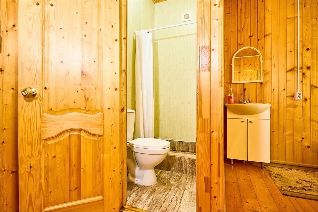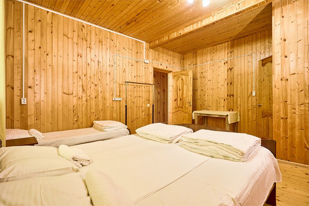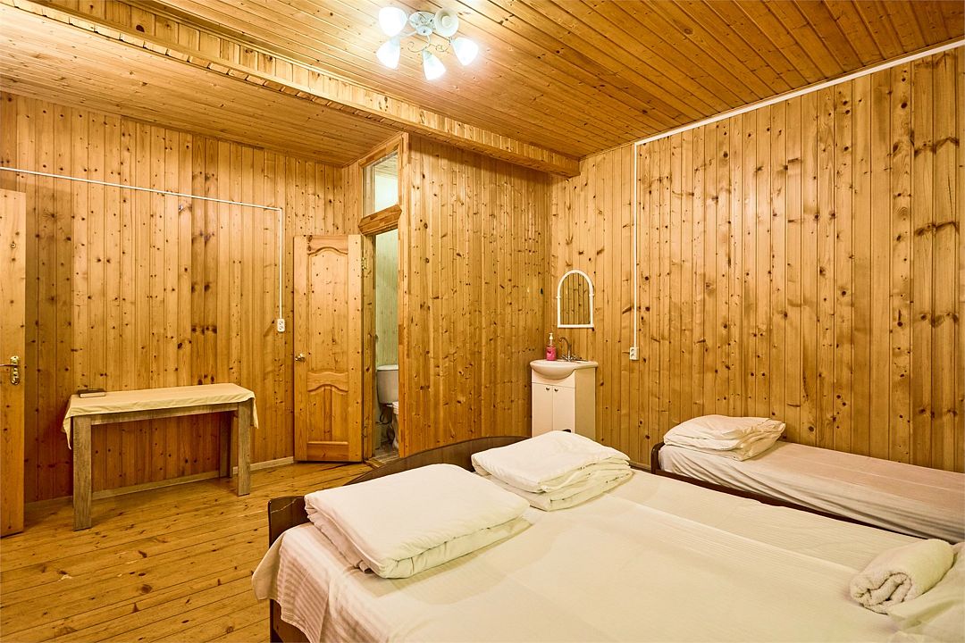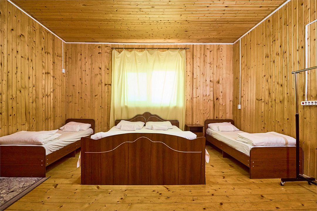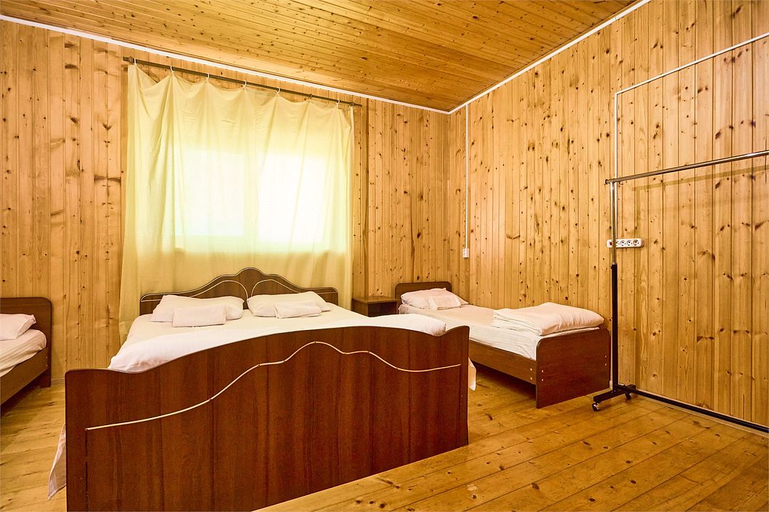 В номере есть двуспальная и две односпальные кровати, а также стулья. Из мебели также предусмотрены холодильник, тумбочка, кондиционер. Санузел оборудован душем. В номере есть стол, раковина, зеркало, вешалка. Интерьер выполнен из дерева.Все услуги