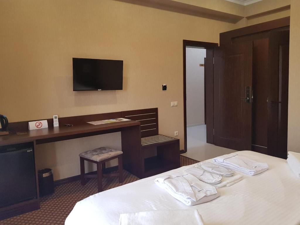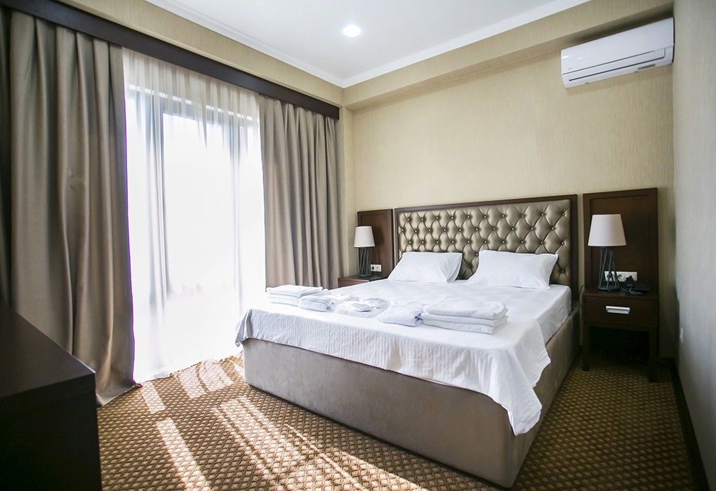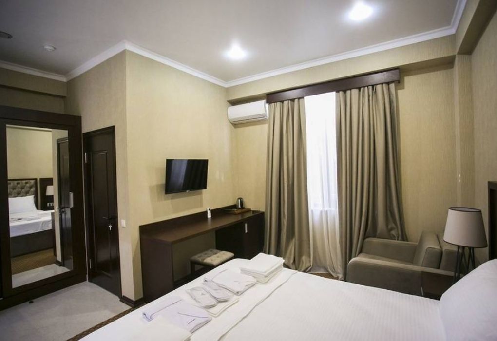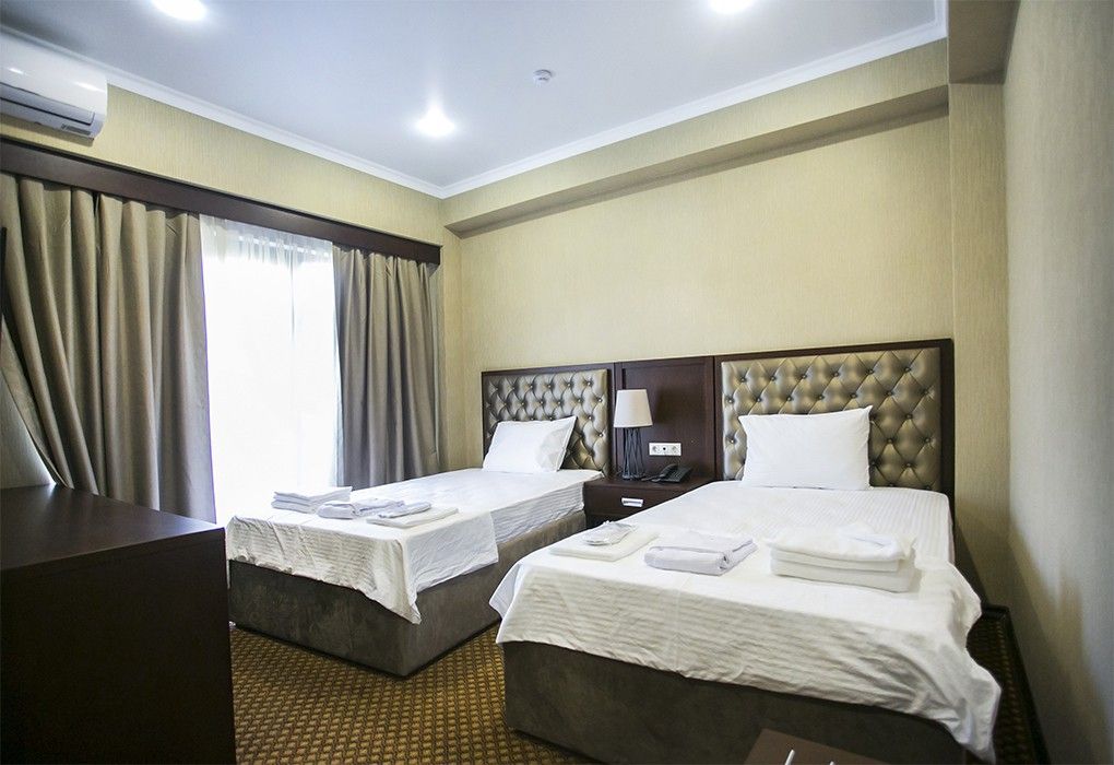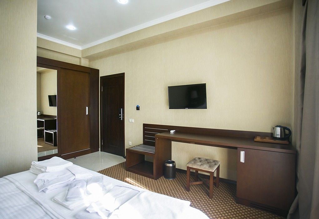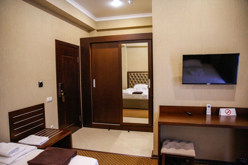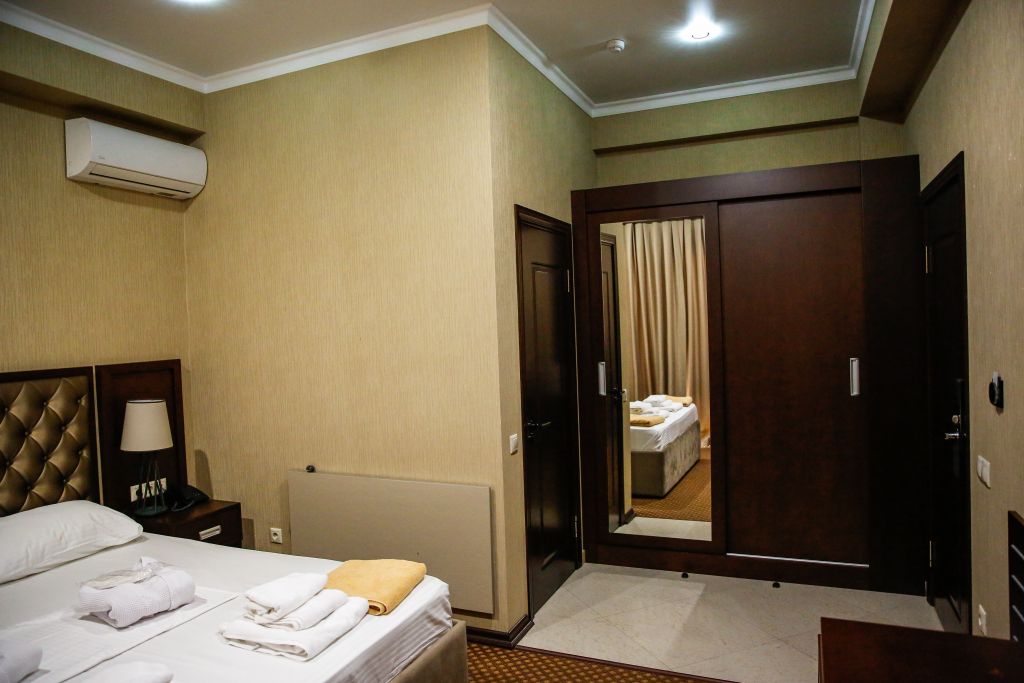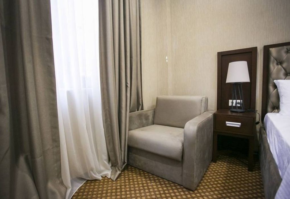 Очень и очень хорошего (прекрасного) уровня отель, почти соответствует заявленным 4 звёздам. Есть не большие недочеты, но только потому что отель ещё достраивается (3 и 4 этажи ещё не запустили). Просторный холл, коридоры и лестница сделаны очень достойно. Материалы хорошо подобраны, чувствуется рука дизайнера. Номера очень чистые и прекрасно оформлены, выдержаны в едином стиле, выглядят дорого и богато. Шикарно подобранна цветовая гамма отделки, текстиля, мебели. Шторы вообще огонь, хорошая современная бытовая техника, современный санузел, в номере есть все необходимое. Кондиционер, обогреватель, чайные принадлежности, мини-бар, телевизор, Wi-Fi, шикарный матрас, дополнительные подушки и одеяло, белоснежное белье, халаты.