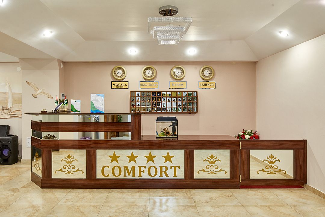 Четырехзвездочный отель «Комфорт» разместился в центральном районе Сухума в 15 минутах ходьбы от ботанического осада и набережной Диоскуров. Рядом — много ресторанов и кафе с национальной кухней. В 5 минутах езды расположен железнодорожный вокзал Сухума, куда прибывают поезда из Москвы, до аэропорта Сочи около 120 километров.