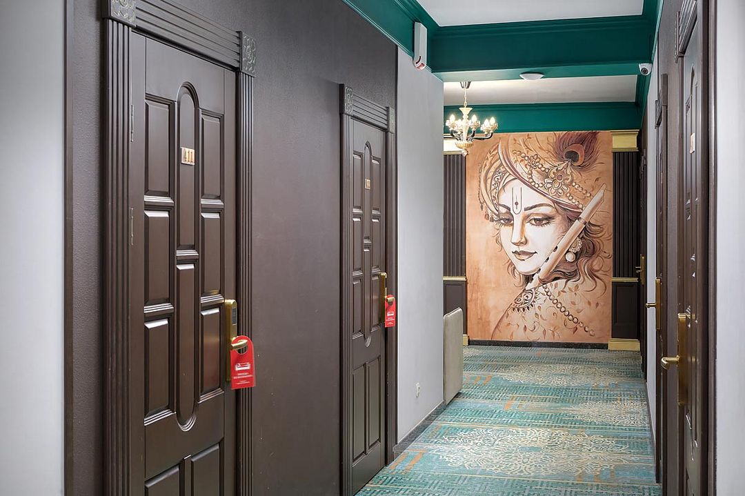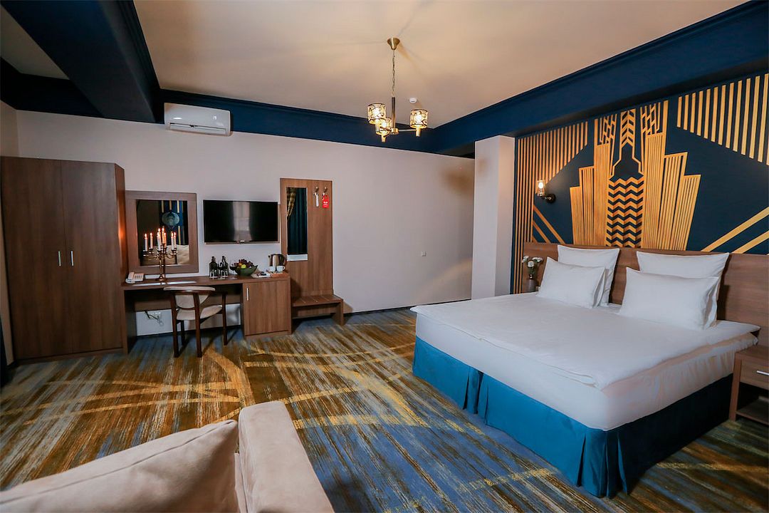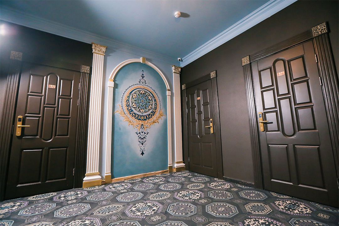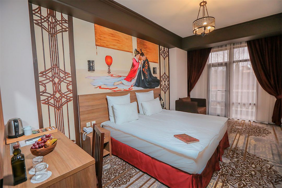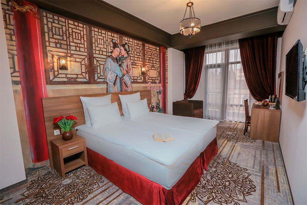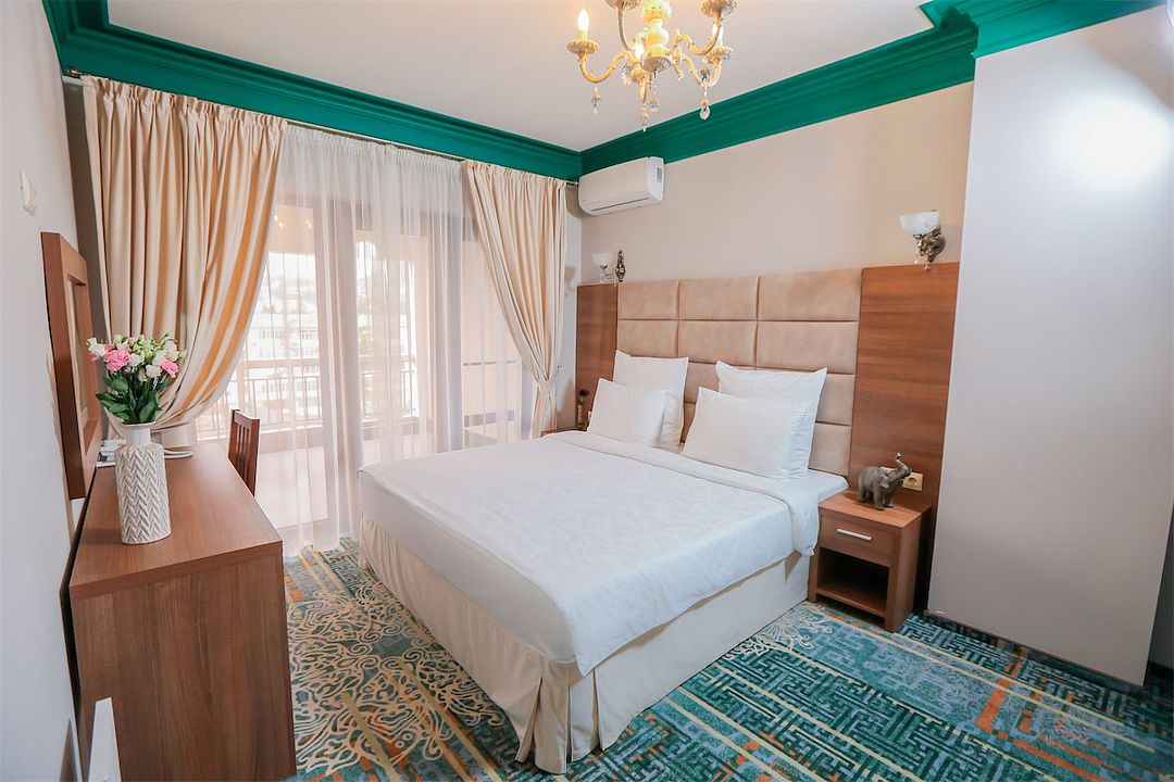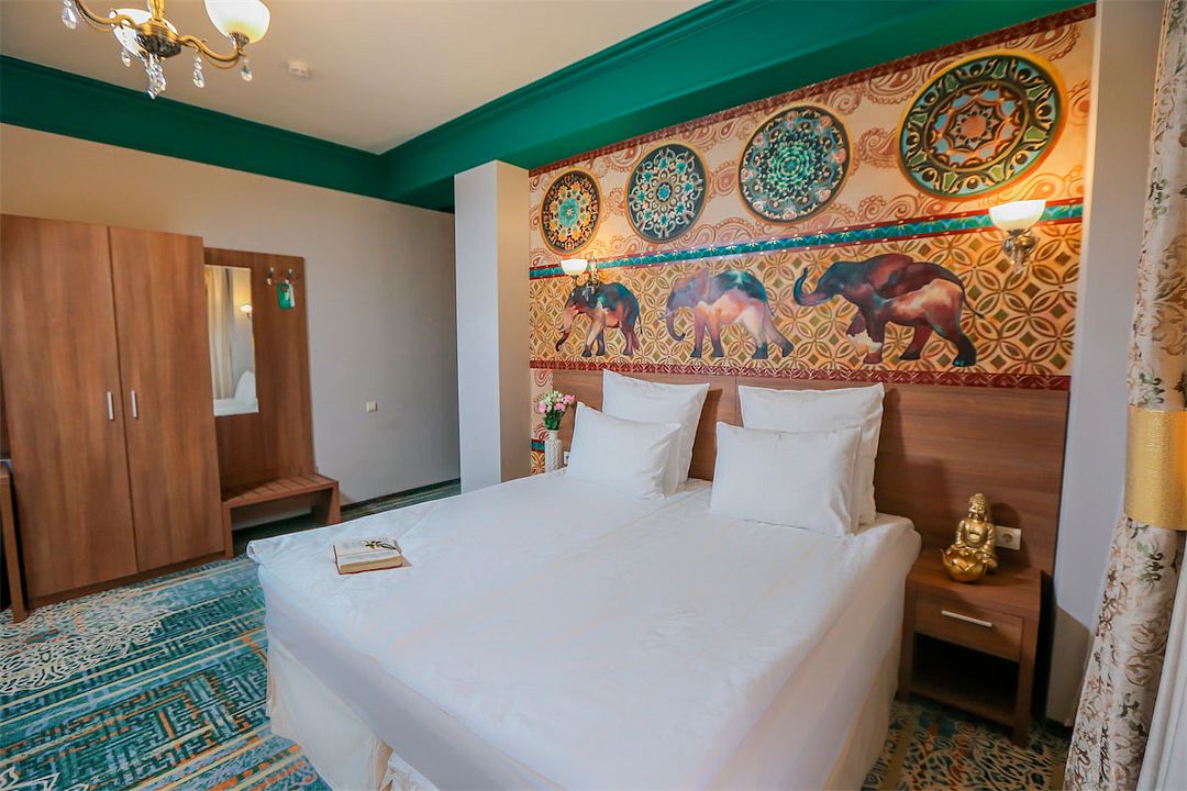 Современный семиэтажный корпус отеля, оснащенный лифтом, располагается в 800 метрах от моря. Дизайнерский интерьер отеля оформлен в интересном восточном стиле, каждый этаж стилизован под определенную страну — Турцию, Египет, Индию. Гостей ожидают комфортабельные номера разных категорий, в каждом есть санузел с душем, установлена спит-система и имеется необходимая бытовая техника: телевизор, холодильник, фен.