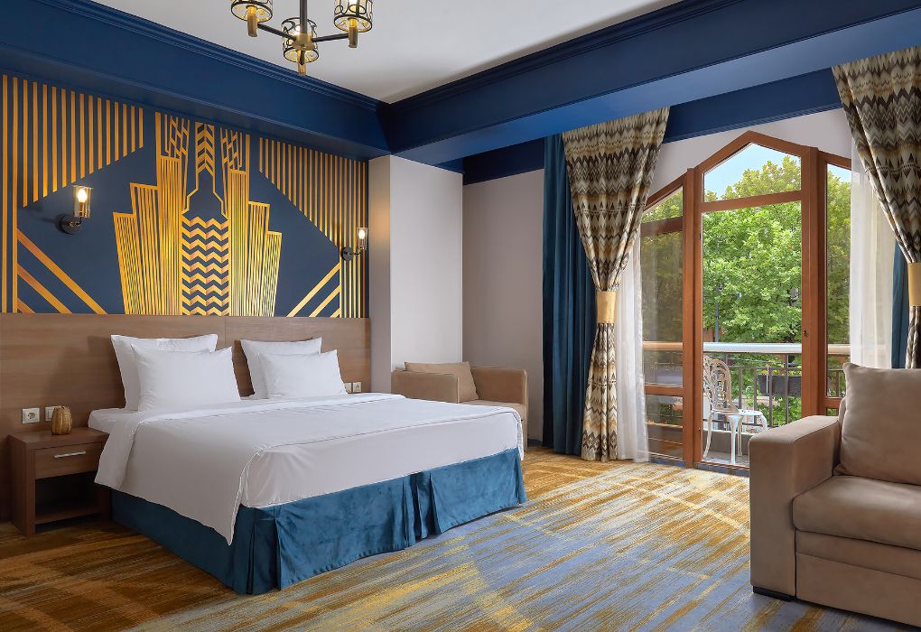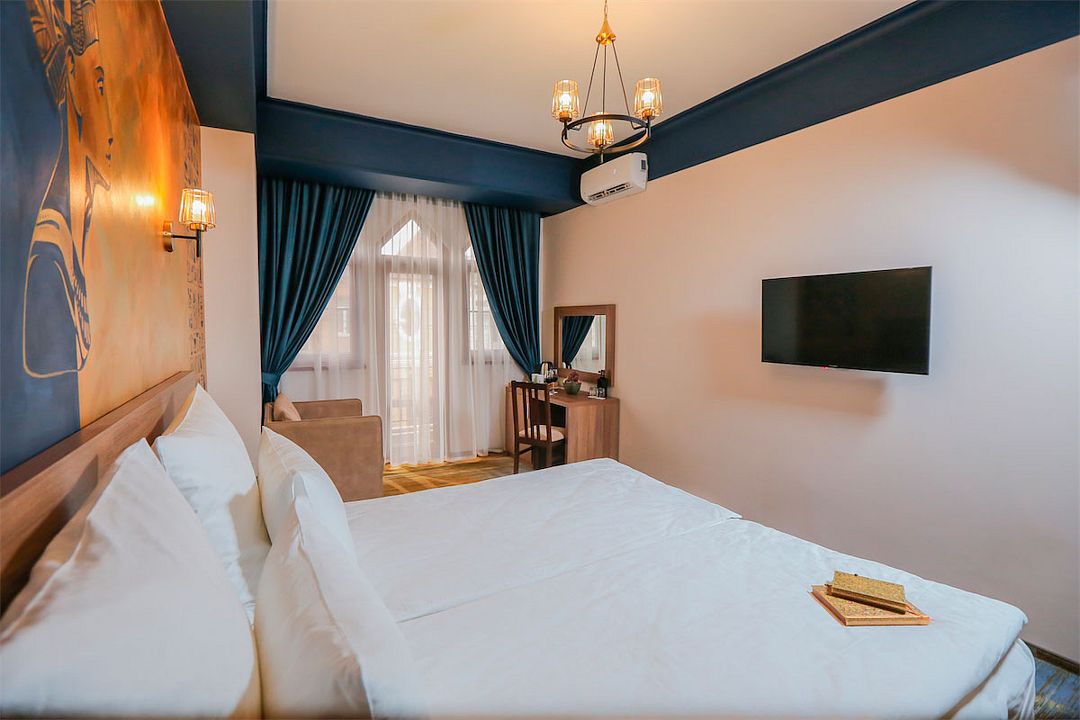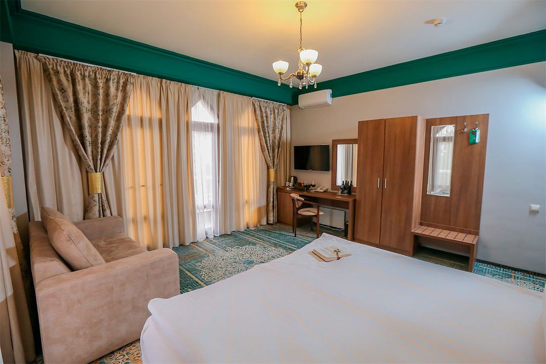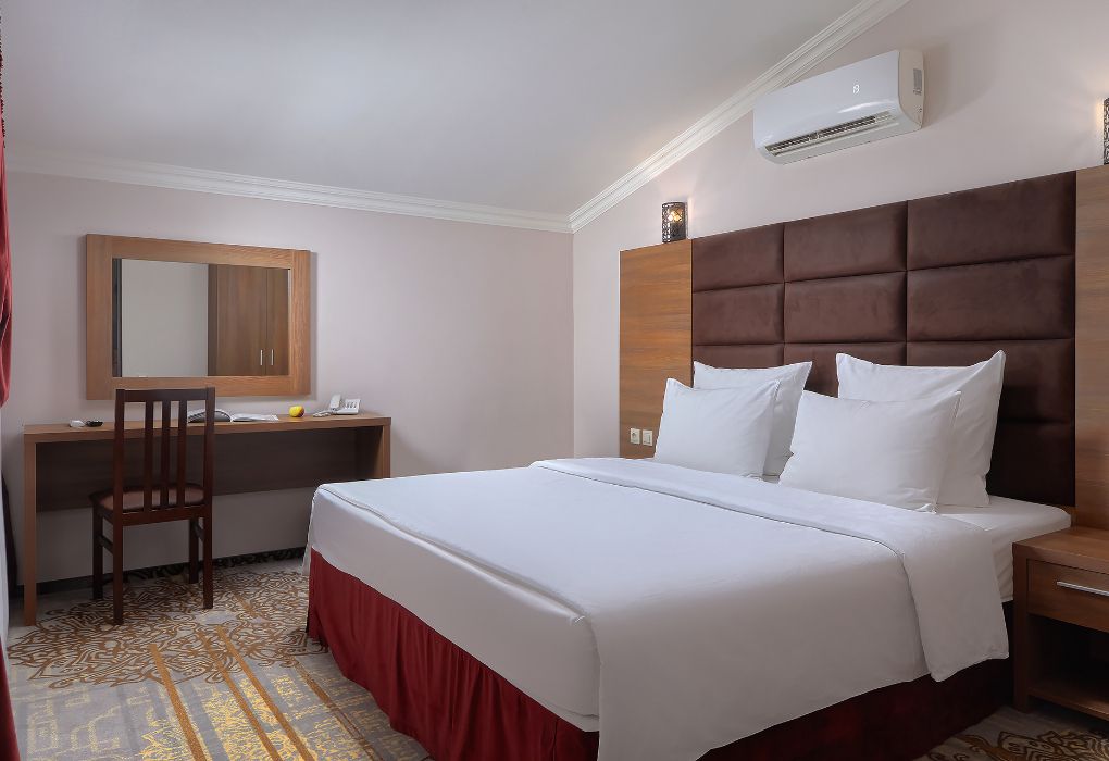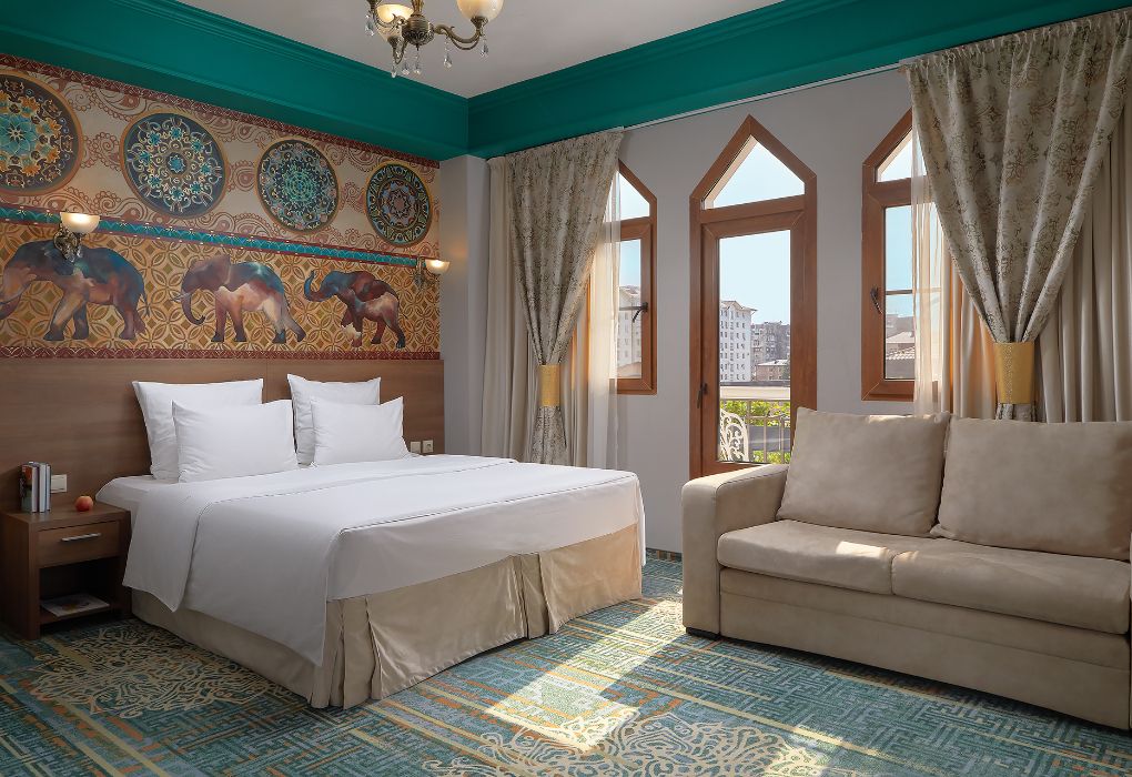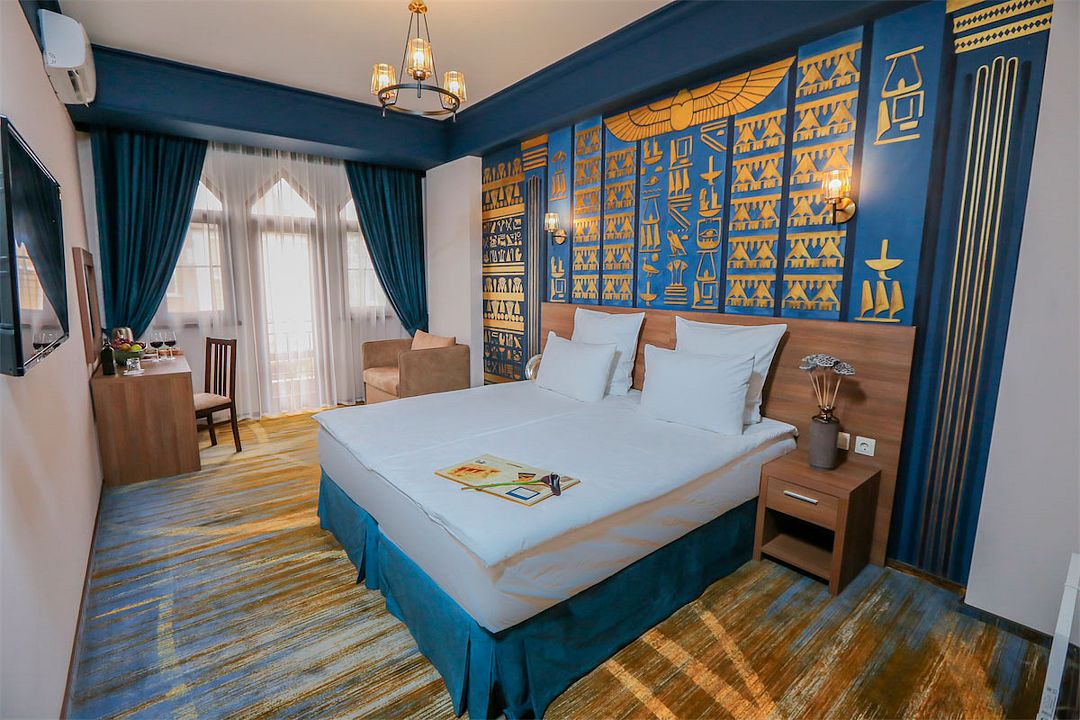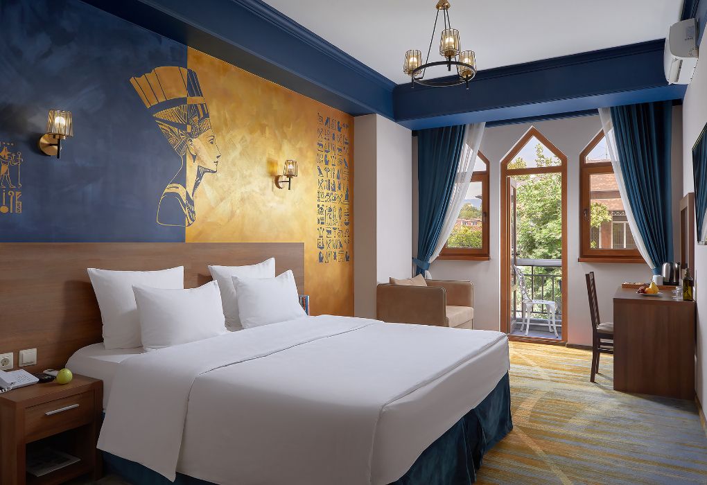 Современный семиэтажный корпус отеля, оснащенный лифтом, располагается в 800 метрах от моря. Дизайнерский интерьер отеля оформлен в интересном восточном стиле, каждый этаж стилизован под определенную страну — Турцию, Египет, Индию. Гостей ожидают комфортабельные номера разных категорий, в каждом есть санузел с душем, установлена спит-система и имеется необходимая бытовая техника: телевизор, холодильник, фен.