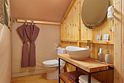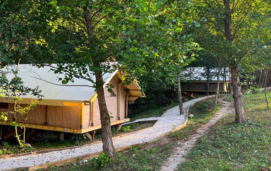 Комплекс занимает территорию площадью чуть больше 11 гектаров, расположенную в горной местности в окружении живописного леса. В распоряжении гостей 50 небольших одноэтажных домиков, выстроенных из экологически чистых материалов. Внутри есть все необходимое для комфортабельного проживания — санузел, кондиционер, электрочайник, фен, мебель для хранения и двуспальная кровать.