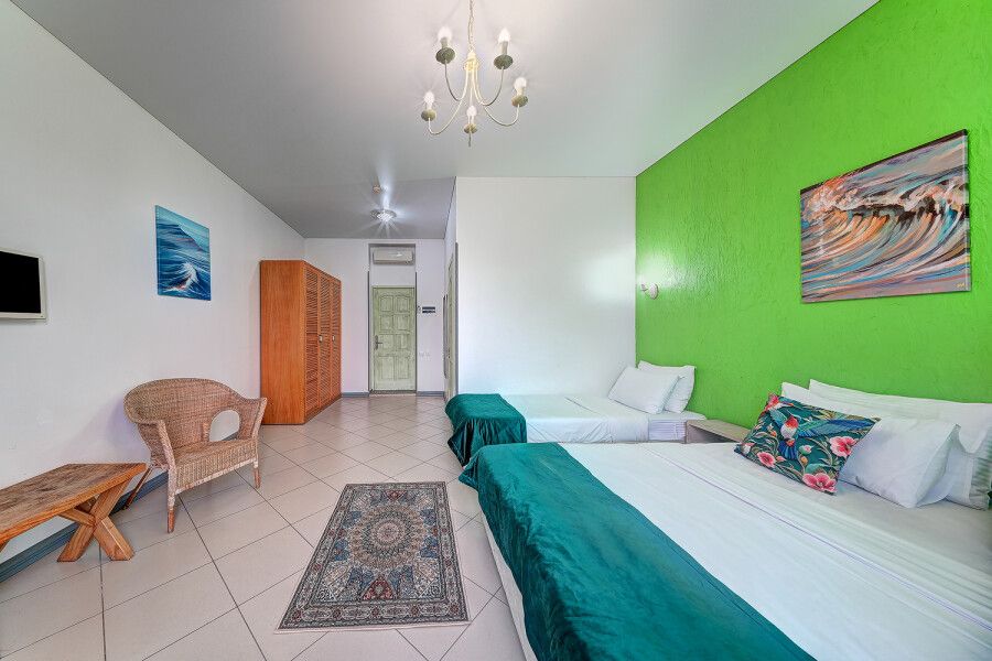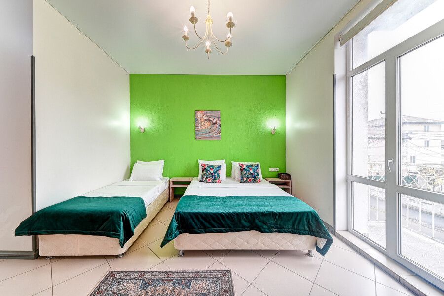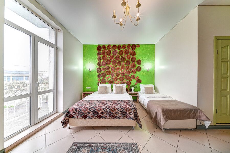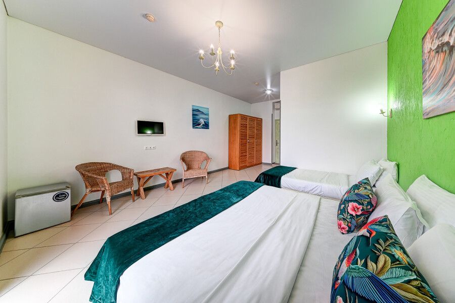 Одна односпальная кровать, одна двуспальная кровать, одно раскладное креслоВ гостиничном номере