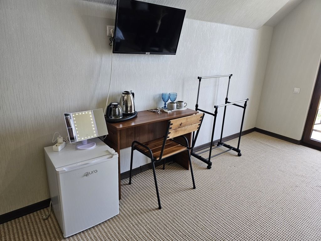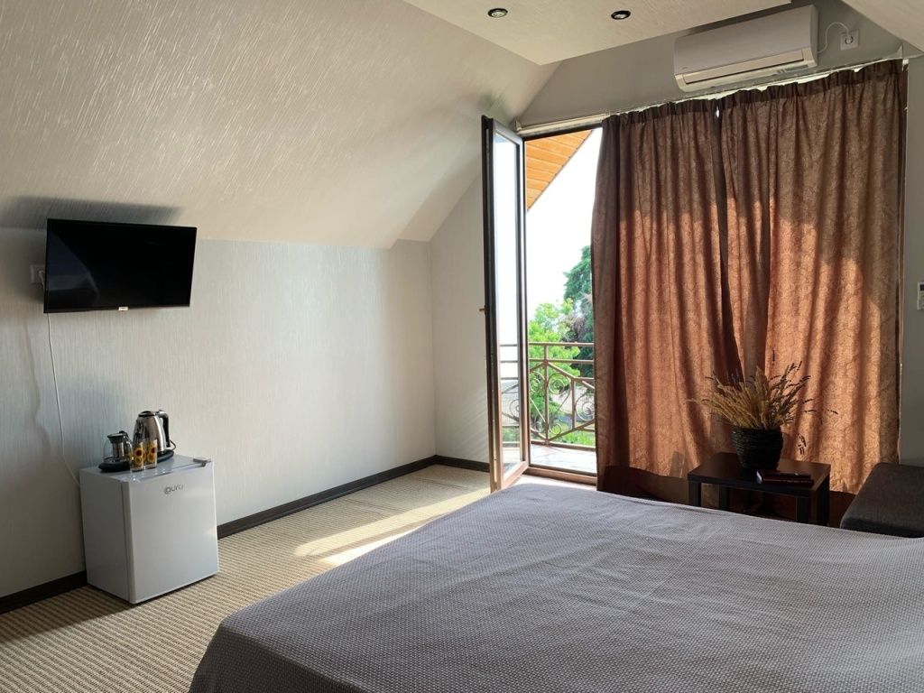 Гостям доступен приусадебный участок с прямым выходом на галечно-песочный пляж. На территории дома оборудована летняя кухня с необходимым инвентарем: электрическая и газовая плиты, микроволновая печь, кофеварка, тостер, различная посуда и приборы. На территории есть зона для отдыха с гамаками, шезлонгами, качелями, турником. Есть возможность приготовления различных блюд на мангале, в тандыре, помпейской печи. Кроме того, можно арендовать сапборды и каноэ. Номера оборудованы необходимым инвентарём, с отдельными санузлами, кондиционерами. В двух номерах есть балконы с видом на море, в одном — с видом на горы. Предусмотрена автономная подача электроэнергии и водоснабжения.