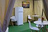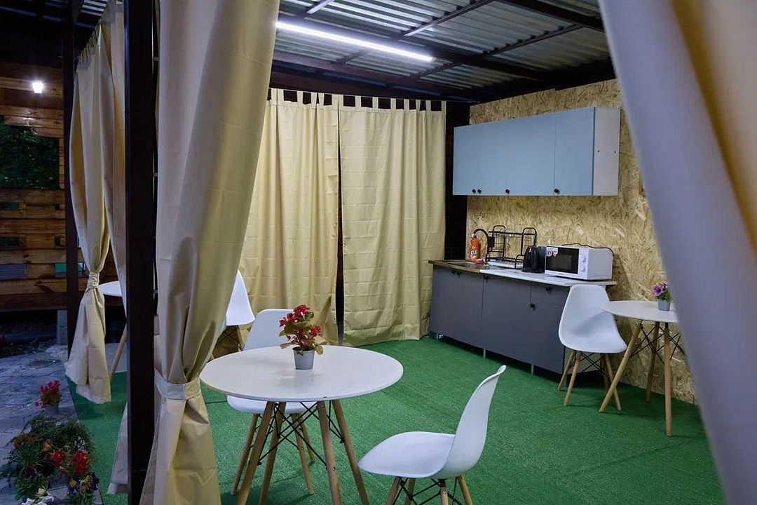 На территории расположена общая кухня, где можно готовить еду самостоятельно. Кухня оснащена всем необходимым: плитой, посудой, микроволновой печью, столами и стульями.
