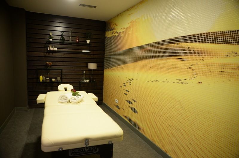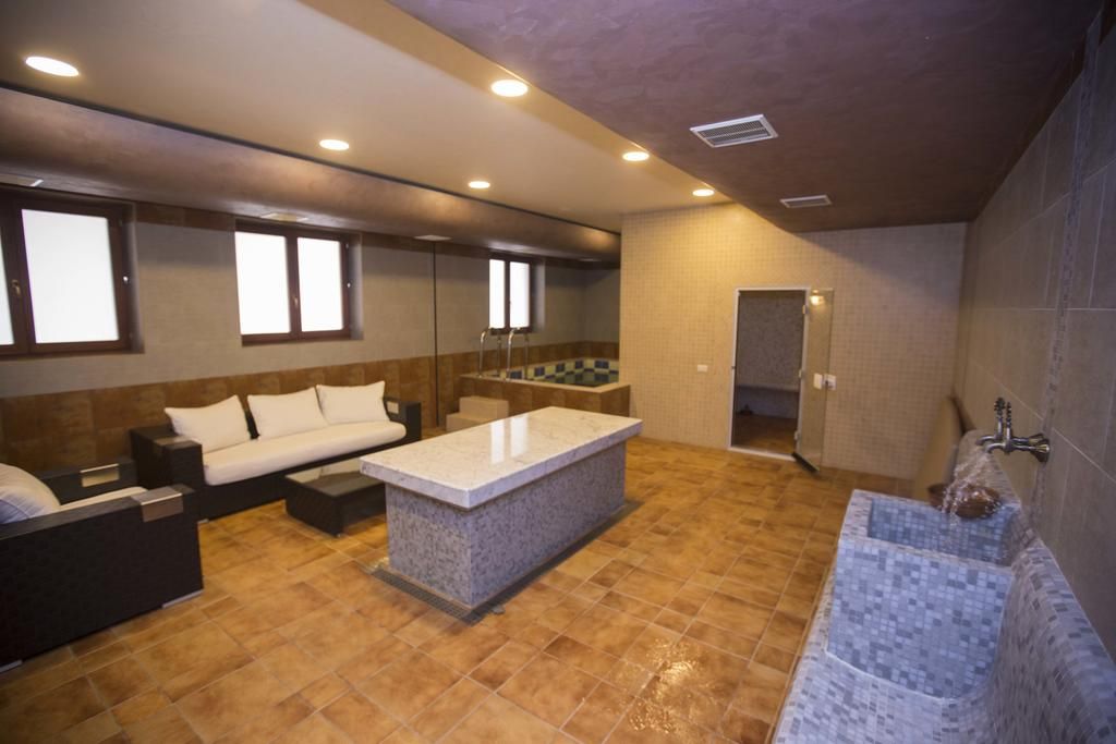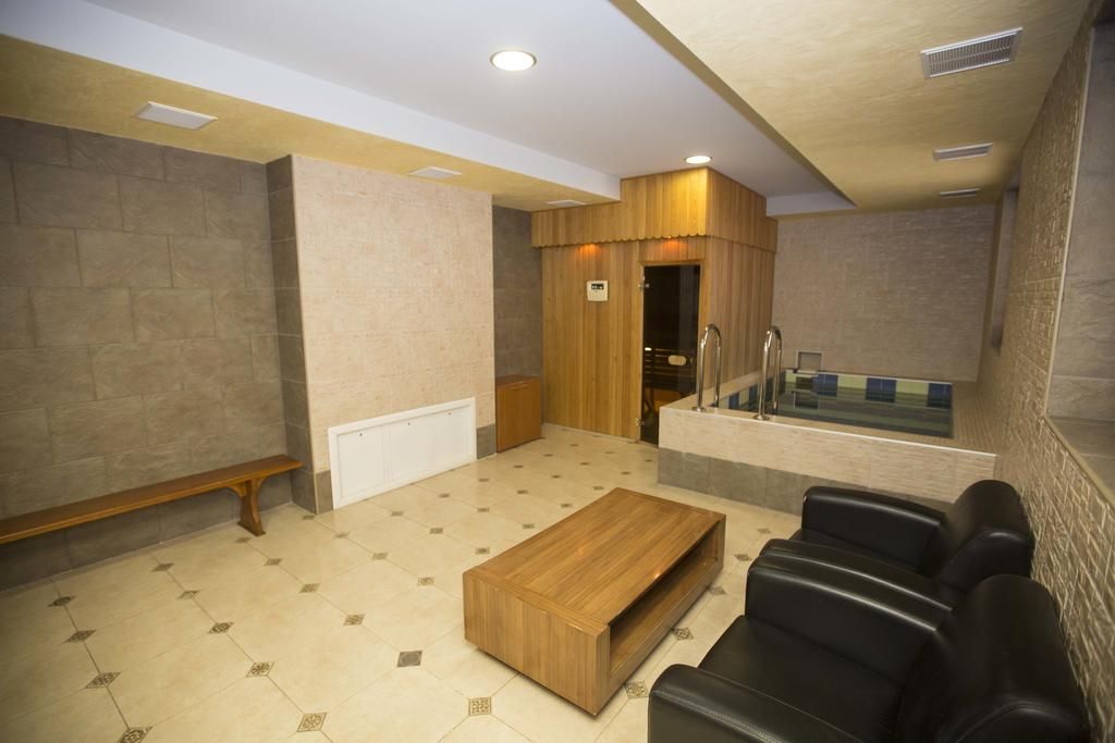 Финская баня оснащена отдельным бассейном с постоянно фильтруемой водой, в котором можно поплавать после парилки, душевой комнатой, предбанником и кожаным мягким холлом. Баня предназначена для 4-х человек. Имеются халаты и другие необходимые банные принадлежности. При необходимости выдаются специальные ароматизаторы. Тут также можно устроить СПА процедуры и массажи.