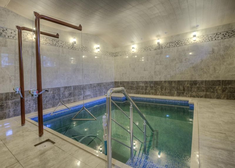Тип бассейна: крытый бассейнВ санатории применяются бальнео-лечебные методы: вытяжения и велотренажёрная разработка суставов нижних конечностей в специально оборудованном бассейне.