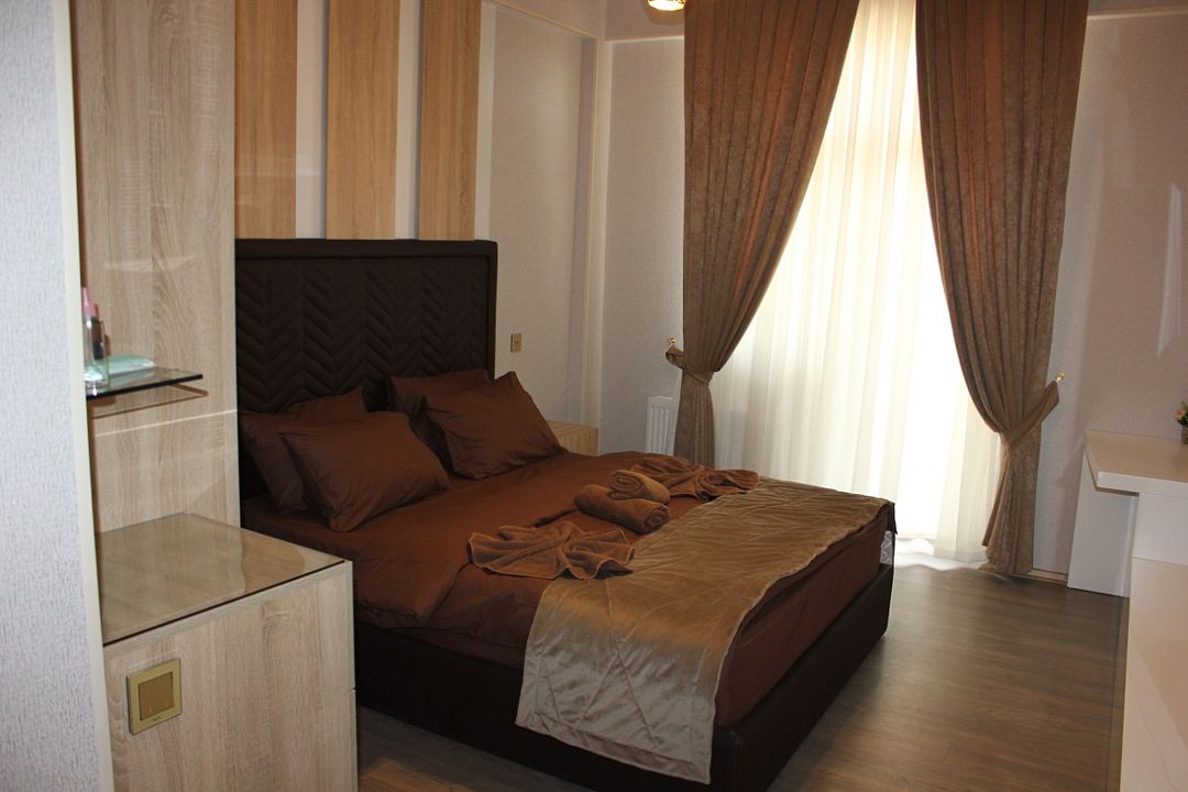 Шестиэтажный современный корпус отеля, оснащенный лифтами, возвышается на благоустроенной территории площадью 2,5 гектара. Помимо спальных номеров корпус включает в себя поликлинику, лечебный центр и спа-отделение. Жилой фонд, рассчитанный на 145 человек, предлагает гостям номера Стандарт, Супериор, Делюкс, Сьют. В комнатах классический интерьер, выдержанный в приятных шоколадных оттенках, есть все необходимое для комфортного размещения: индивидуальный санузел с душем, кондиционер, бытовая техника.