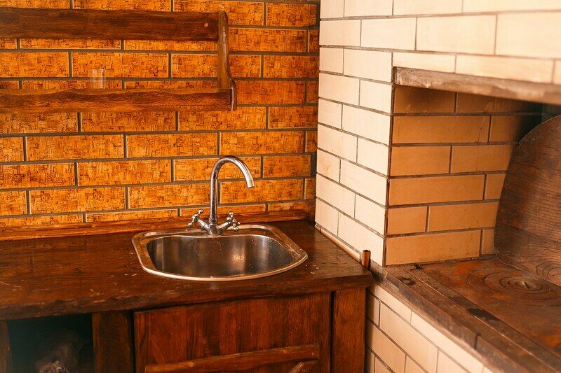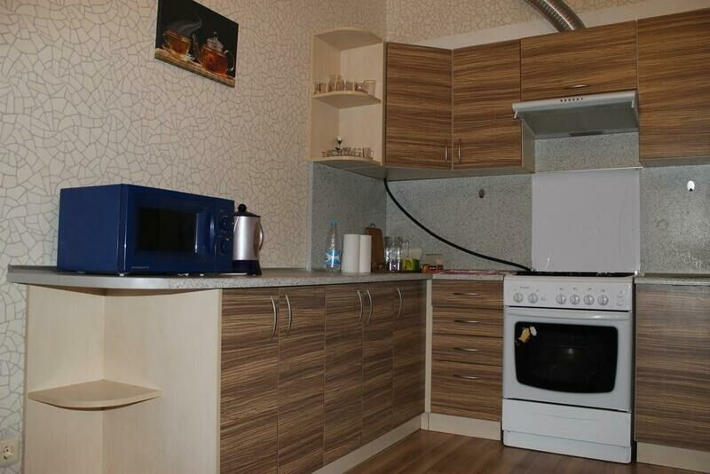 Двухэтажный коттедж для отпуска с отдельным входом, диваном и плитой.