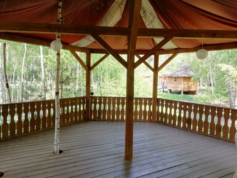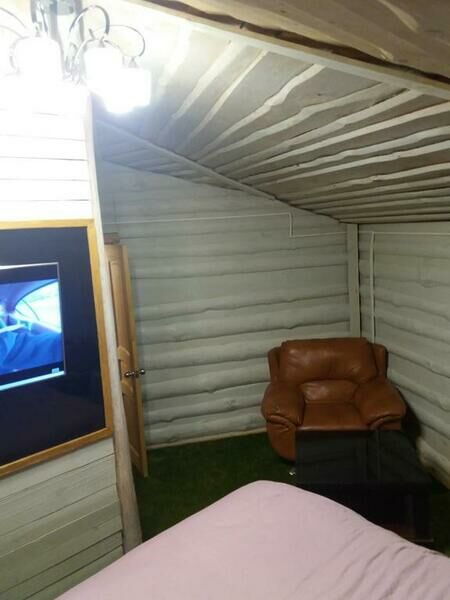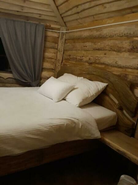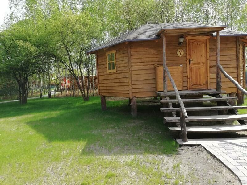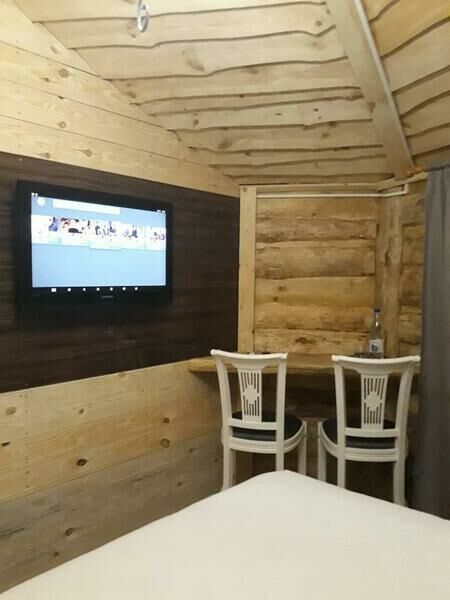 В домике имеется 2-х спальная дубовая кровать, одноместный раскладной диван для ребенка, тв, чайник, посуда, с/у (туалет, умывальник, душевая кабина), полотенце для лица и тела. Размер дома: 22 м².