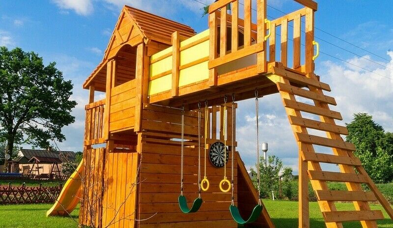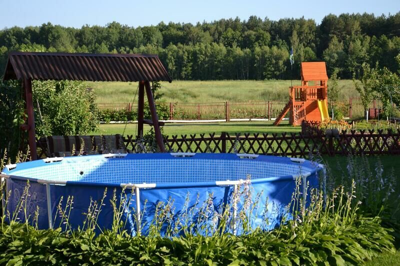 Детская площадка с качелями, горкой, канатной паутинкой, смотровой площадкой и с сеновалом. Также есть батут.