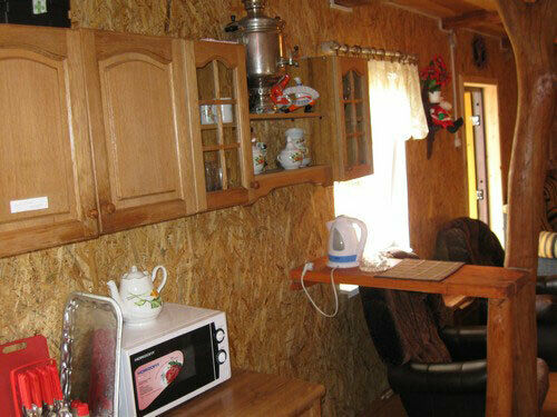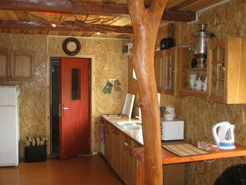 Далее идет кухня, там находится: газовая плита, холодильник, микроволновая печь, чайник, посуда на 30 персон и т.д.