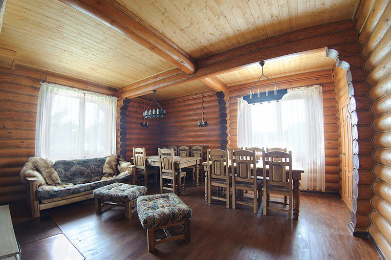 Просторный гостиный зал с камином, двумя банкетными столами, спутниковое TV, DVD, караоке.