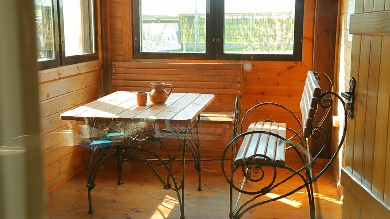 - Зона 2: небольшое пространство кухни, стол со скамьями для отдыха;