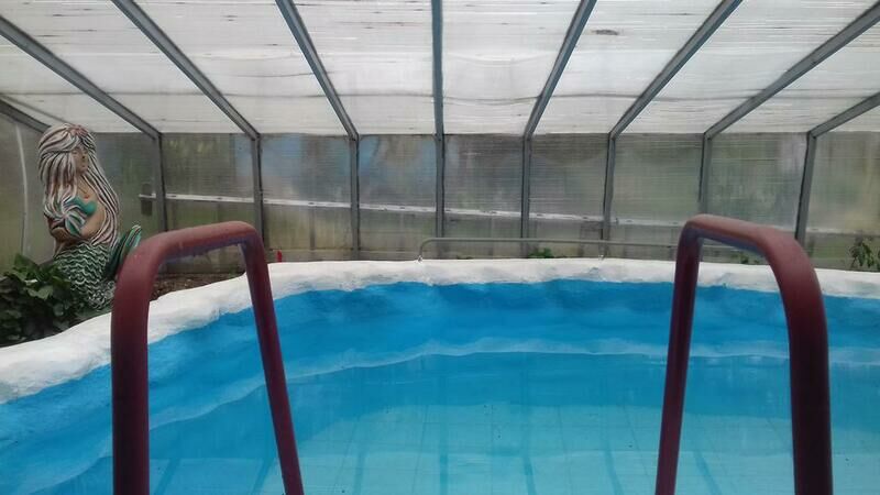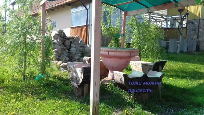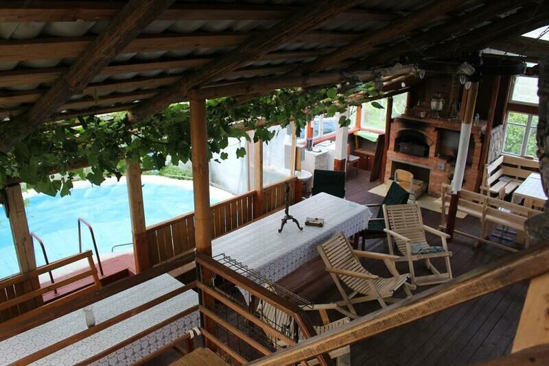 Большое пространство для отдыха, питания и общения под навесом. С печкой для шашлыка и бассейном.