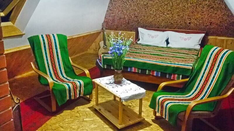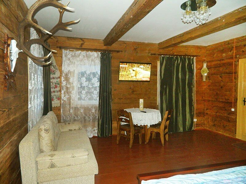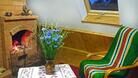 Подойдёт для большой компании или семьи. В комнате находится угловой и раздвижной диван, большой круглый стол с деревянными стульями ручной работы, а также вместительный шкаф для багажа. Телевизор с большим плоским экраном. Печь с топочной дверью из стекла позволят любоваться огнем.