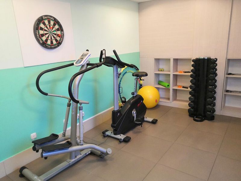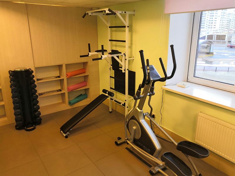 Тренажерный зал расположен на втором этаже и предоставляет все необходимое для тренировок на любой вкус — велотренажеры, гантели, эллиптические тренажеры, гимнастические мячи, обручи и силовое оборудование.