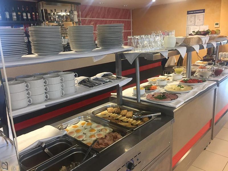 Завтрак,мы решили посмотреть что входит и на месте оплатить,если захотим.Шведский стол,есть выбор еды:каша(очень вкусная),грудинка поджареная,сосиски,яйца вареные и жареные,омлет,сервелат,красная рыба(лосось или семга)овощи,яблоки,йогурты,творог,сметана,орешки,персики консервированные,джемы,соки,кофе,чай,все свежее и очень вкусное,сытно можно поесть на весь день,20р на одного.