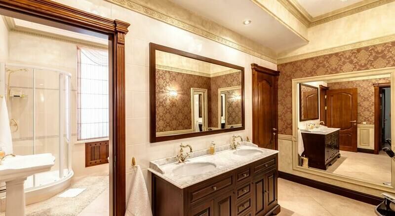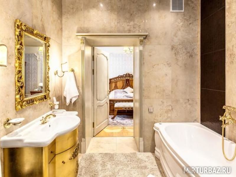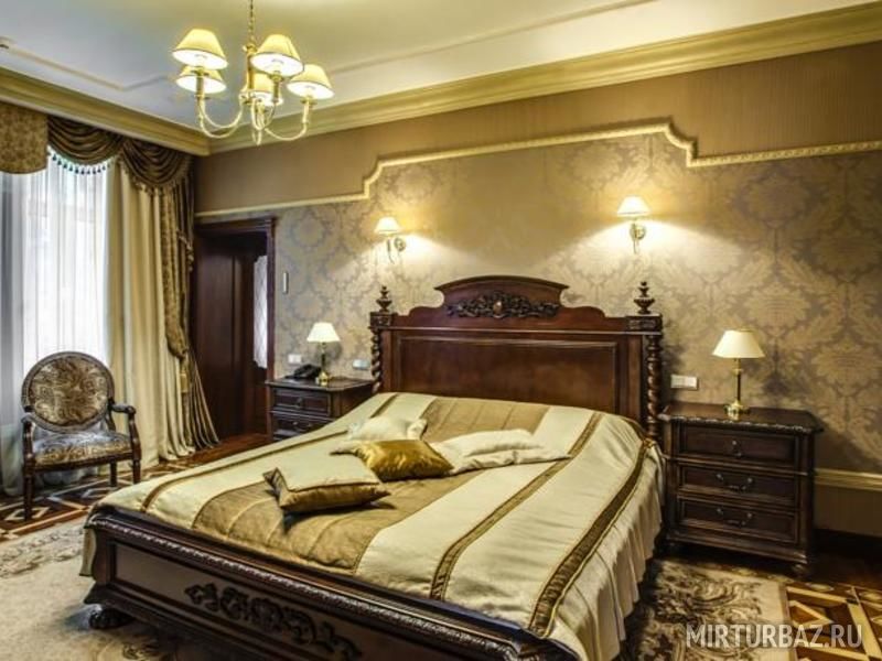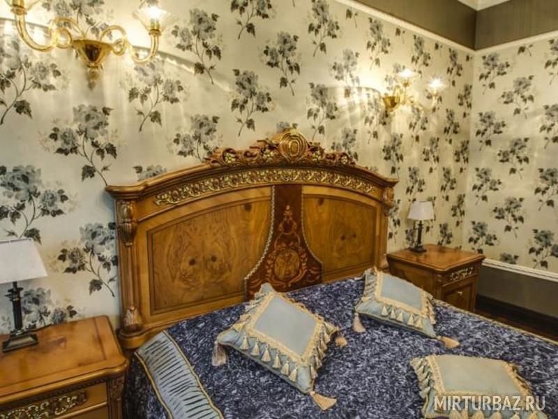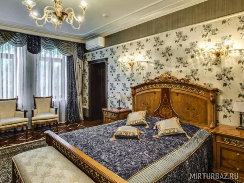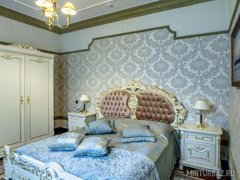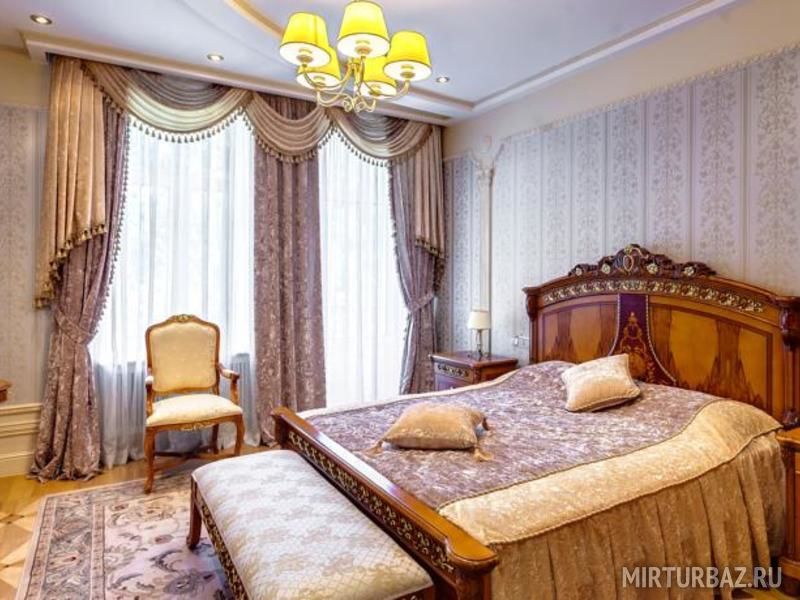 Большой двухуровневый номер с двумя спальнями, в каждой из которой большая двуспальная кровать. Размер номера 324 м².
