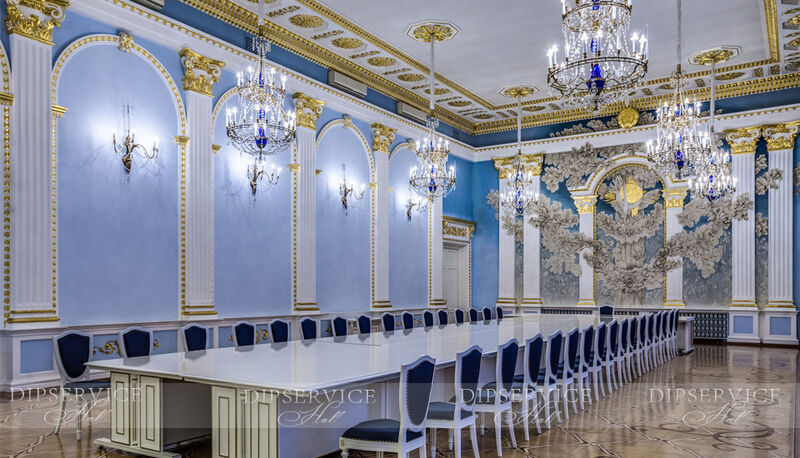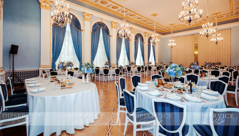 Голубой зал площадью 190 кв. метров является главным залом Dipservice Hall. Общая вместимость зала до 180 (банкет, конференция) человек и до 600 (фуршет) человек. Доступ в зал осуществляется через аванзал и гостиную, минуя зимний сад. Учитывая, что из Голубого зала имеется прямой доступ в кухню и подсобное помещение, он прекрасно подходит для проведения приемов, раутов, фуршетов, банкетов и других торжественных мероприятий, которые сопровождаются угощением гостей напитками и закусками.