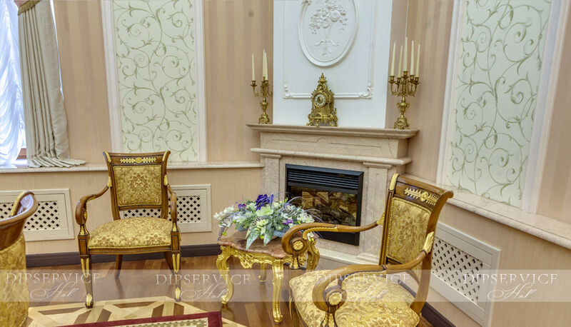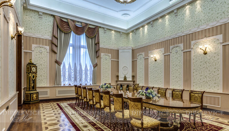 Эти мероприятия лучше организовать в Каминном зале, центральную часть которого занимает овальный стол со стульями, рассчитанный на 16 персон.