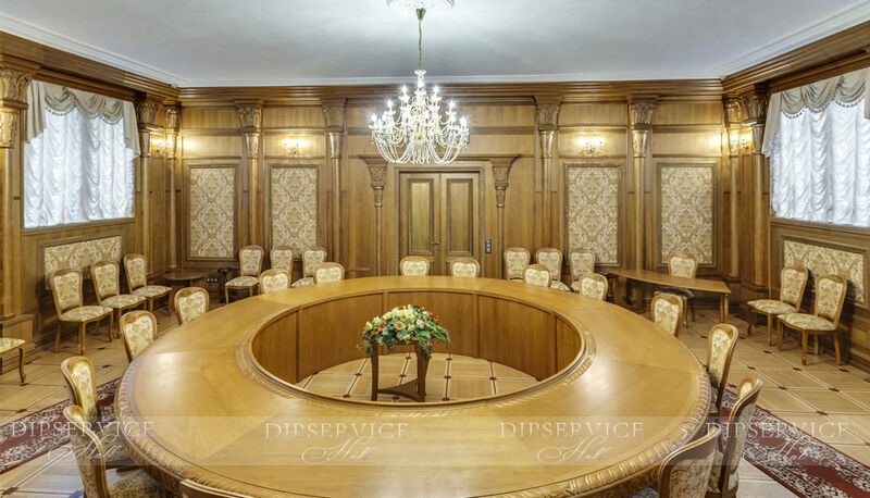 Эти мероприятия лучше организовать в Деревянном зале, центральную часть которого занимает круглый стол со стульями, рассчитанный на 16 персон. При этом в зале комфортно могут располагаться до 40 человек. Одна из особенностей зала – два выхода – благодаря чему в нем можно проводить встречи независимо от других проходящих в Dipservice Hall мероприятий.