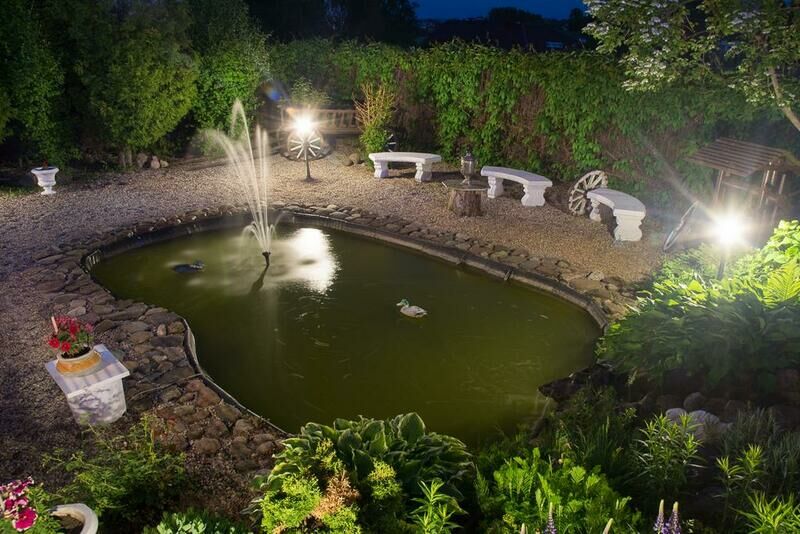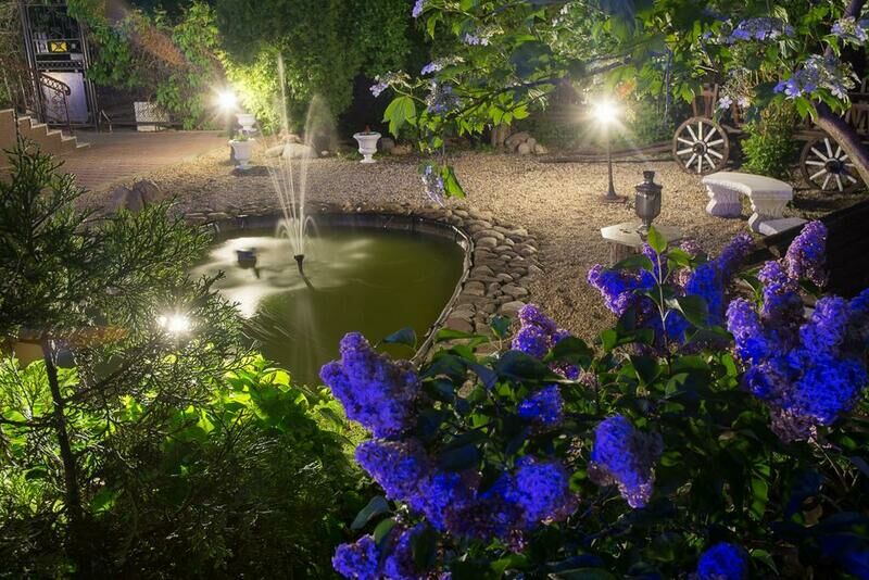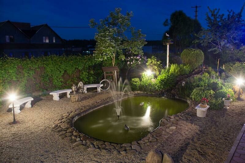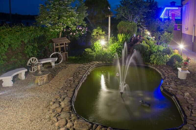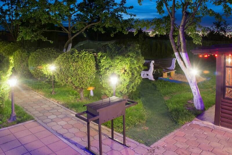 За оградой из зеленого виноградника благоухают аллеи из туй, альпийская горка, ухоженный газон, фруктовый сад. Далее поблёскивает пруд с фонтаном и ночной подсветкой, а за ними возвышается современный трехуровневый коттедж. Рядом находятся открытая и закрытая беседки с музыкальным центром, качели, оборудованное место для приготовления шашлыков с мангалом, детская площадка. Имеется удобная парковка.