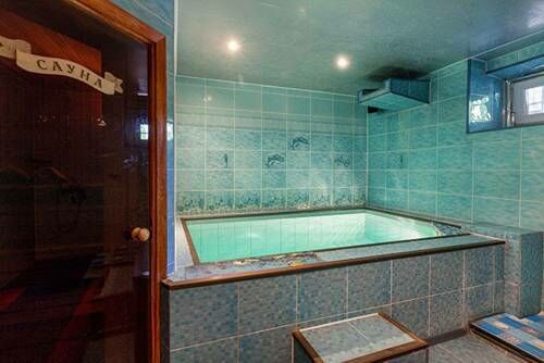 Любителей горячего пара обрадует сауна с лазурным бассейном с подсветкой и уютной комнатой отдыха с камином и массажным креслом. Стоимость аренды сауны включена в аренду коттеджа.
