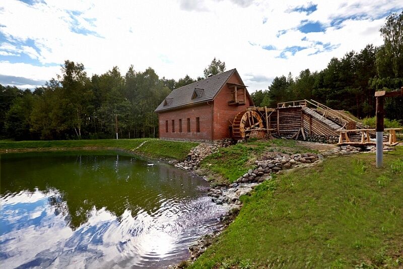 На берегу живописного пруда с водоплавающими птицами, с высаженными декоративными растениями стоит водяная мельница. Диаметр колеса, на которое падает около 70 литров воды в секунду, составляет целых 4 метра. К нему можно приблизиться. Более того, вам придется это сделать, если вы захотите попасть внутрь мельницы. А посмотреть там есть на что.