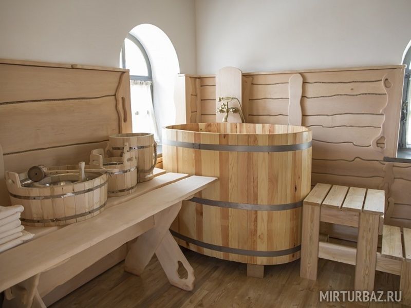 Отдельный банный комплекс с подогревом полов с сухой сауной, большой деревянной купелью, душем.